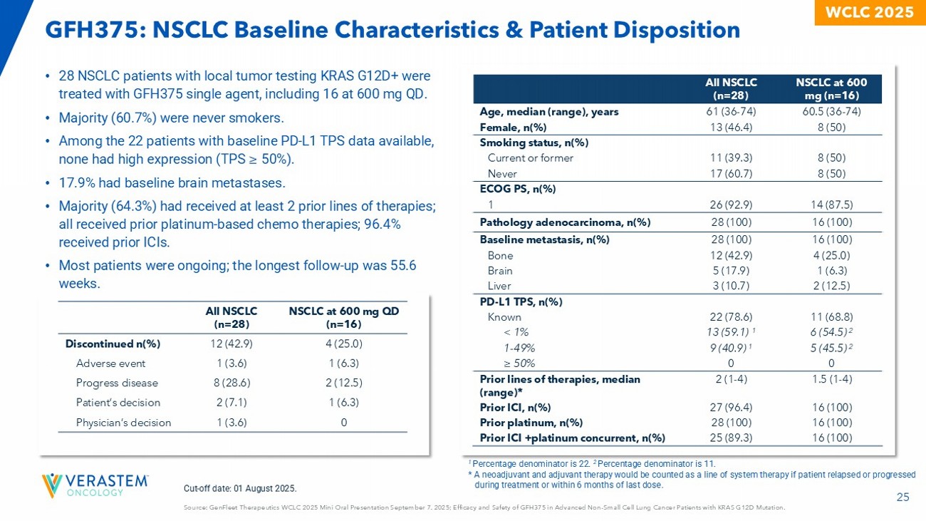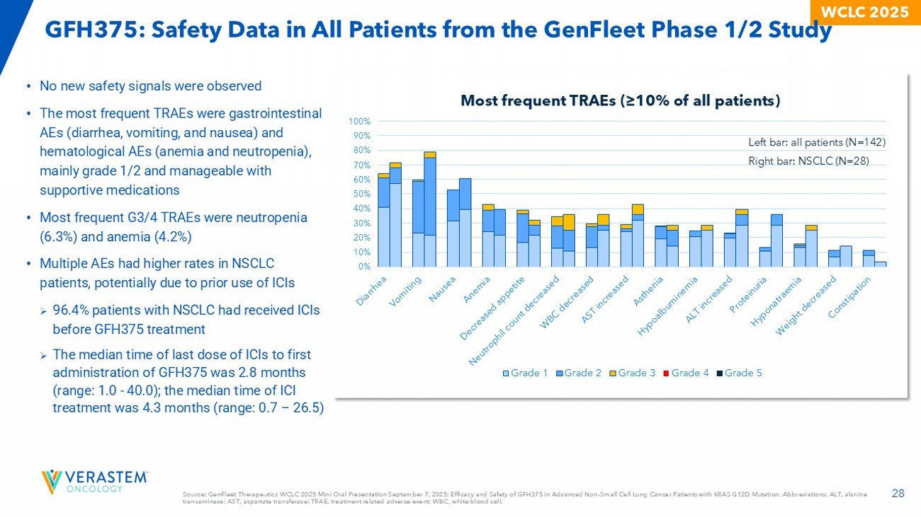 27 WCLC 2025 GFH375: Safety Data in All Patients from the GenFleet Phase 1/2 Study Source: GenFleet Therapeutics WCLC 2025 Mini Oral Presentation September 7. 2025; Efficacy and Safety of GFH375 in Advanced N on - Small Cell Lung Cancer Patients with KRAS G12D Mutation. • 142 patients, including 28 NSCLC, with advanced KRAS G12D mutation were treated with GFH375 single agent . » 93% had baseline ECOG PS = 1. » 75% had received at least ≥ 2 prior lines of therapies. • 97 patients, including 16 NSCLC, were treated at 600 mg QD. • No treatment related death. • 4.2% of patients discontinued treatment due to TRAEs. Dose intensity = 90%. • 27.5% of patients had grade 3/4 TRAEs. • Overall, GFH375 has manageable safety profile in previously treated advanced cancer patients. • Grade ≥3 TRAEs and SAEs are more frequent in NSCLC patients; however, discontinuation rate appears to be similar. 600 mg QD All dose levels Adverse events, n(%) NSCLC (N=16) All types (N=97) NSCLC 2 (N=28) All types 1 (N=142) TEAEs 16 (100) 96 (99.0) 28 (100) 141 (99.3) All grades 7 (43.8) 41 (42.3) 15 (53.6) 60 (42.3) Grade ≥ 3 3 (18.8) 19 (19.6) 6 (21.4) 27 (19.0) SAE 4 (25.0) 31 (32.0) 10 (35.7) 51 (35.9) Leading to interruption 3 (18.8) 7 ( 7.2) 5 (17.9) 12 ( 8.5) Leading to reduction 1 (6.3) 6 (6.2) 1 (3.6) 9 (6.3) Leading to discontinuation 0 3 (3.1) 0 4 (2.8) Leading to death TRAEs 16 (100) 96 (99.0) 28 (100) 139 (97.9) All grades 6 (37.5) 25 (25.8) 13 (46.4) 39 (27.5) Grade ≥ 3 2 (12.5) 8 (8.2) 4 (14.3) 11 (7.7) SAE 3 (18.8) 19 (19.6) 9 (32.1) 33 (23.2) Leading to interruption 3 (18.8) 7 (7.2) 5 (17.9) 11 (7.7) Leading to reduction 1 ( 6.3) 4 (4.1) 1 ( 3.6) 6 (4.2) Leading to discontinuation 0 0 0 0 Leading to death Data c ut - off date: 17 Jun 2025 The median exposure time to GFH375 in all patients was 9.6 (range: 0.9 - 49.1) week s by the cut - off date. 1 Including all patients treated at all dose levels: 100 mg QD (n=1), 200 mg QD (n=1), 400 mg QD (n=29), 600 mg QD (n=97), 750 m g QD (n=8) , 900 mg QD (n=3), and 300 mg BID (n=3). 2 Including NSCLC patients treated at all dose levels: 100 mg QD (n=1), 200 mg QD (n=1), 400 mg QD (n=7), 600 mg QD (n=16), 7 50 mg QD (n=1) , and 300 mg BID (n=2). SAE, serious adverse event; TEAE, treatment emergent adverse event; TRAE, treatment related adverse event.