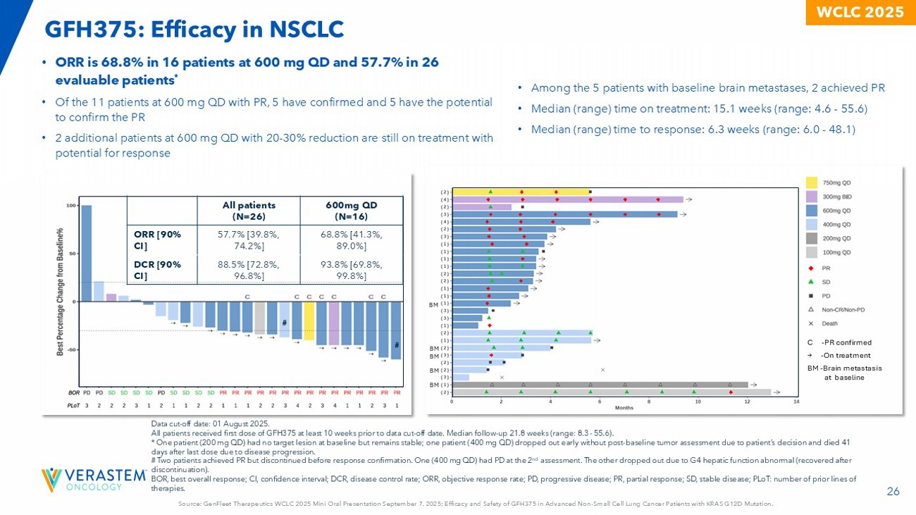 25 Source: GenFleet Therapeutics WCLC 2025 Mini Oral Presentation September 7. 2025; Efficacy and Safety of GFH375 in Advanced N on - Small Cell Lung Cancer Patients with KRAS G12D Mutation. WCLC 2025 Cut - off date: 01 August 2025. NSCLC at 600 mg QD (n=16) All NSCLC (n=28) 4 (25.0) 12 (42.9) Discontinued n(%) 1 (6.3) 1 (3.6) Adverse event 2 (12.5) 8 (28.6) Progress disease 1 (6.3) 2 (7.1) Patient’s decision 0 1 (3.6) Physician’s decision • 28 NSCLC patients with local tumor testing KRAS G12D+ were treated with GFH375 single agent, including 16 at 600 mg QD. • Majority (60.7%) were never smokers. • Among the 22 patients with baseline PD - L1 TPS data available, none had high expression (TPS ≥ 50%). • 17.9% had baseline brain metastases. • Majority (64.3%) had received at least 2 prior lines of therapies; all received prior platinum - based chemo therapies; 96.4% received prior ICIs. • Most patients were ongoing; the longest follow - up was 55.6 weeks. NSCLC at 600 mg (n=16) All NSCLC (n=28) 60.5 (36 - 74) 61 (36 - 74) Age, median (range), years 8 (50) 13 (46.4) Female, n(%) Smoking status, n(%) 8 (50) 11 (39.3) Current or former 8 (50) 17 (60.7) Never ECOG PS, n(%) 14 (87.5) 26 (92.9) 1 16 (100) 28 (100) Pathology adenocarcinoma, n(%) 16 (100) 28 (100) Baseline metastasis, n(%) 4 (25.0) 12 (42.9) Bone 1 (6.3) 5 (17.9) Brain 2 (12.5) 3 (10.7) Liver PD - L1 TPS, n(%) 11 (68.8) 22 (78.6) Known 6 (54.5) 2 13 (59.1) 1 < 1% 5 (45.5) 2 9 (40.9) 1 1 - 49% 0 0 ≥ 50% 1.5 (1 - 4) 2 (1 - 4) Prior lines of therapies, median (range) * 16 (100) 27 (96.4) Prior ICI, n(%) 16 (100) 28 (100) Prior platinum, n(%) 16 (100) 25 (89.3) Prior ICI +platinum concurrent, n(%) 1 Percentage denominator is 22. 2 Percentage denominator is 11. * A neoadjuvant and adjuvant therapy would be counted as a line of system therapy if patient relapsed or progressed during treatment or within 6 months of last dose. GFH375: NSCLC Baseline Characteristics & Patient Disposition