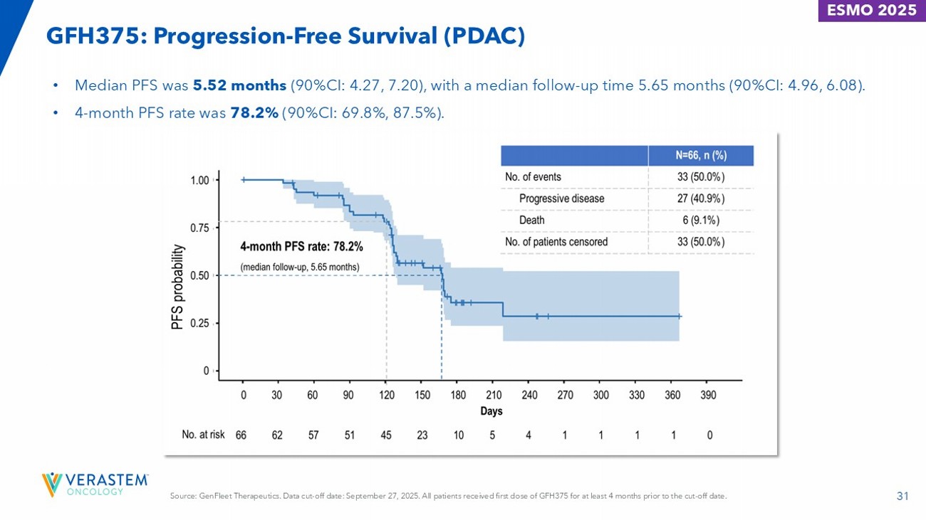 30 GFH375: Best Overall Response (PDAC) Changes from baseline in target lesions 20 50 0 - 30 - 5 0 0 100 200 300 Time since study treatment initiation (days) 20 - 30 Best % changes from baseline in target lesions - 50 0 N=59 40.7% [30%, 52%] ORR [90%CI] Best overall response, n (%) 24 (40.7) Partial response 33 (55.9) a Stable disease 2 (3.4) b Progressive disease 96.7% [90%, 99%] DCR [90%CI] • ORR was 40.7% (24/59), 90%CI was [30%, 52%] in the 59 evaluable patients. • DCR was 96.7% (57/59), 90%CI was [90%, 99%]; Majority (91.5%) had reduction in target lesions. ESMO 2025 Partial response Stable disease Progressive disease Source: GenFleet Therapeutics. Data cut - off date: September 27, 2025. All patients received first dose of GFH375 at least 4 mont hs prior to the cut - off date. Seven patients had no post - treatment tumor assessments due to early dropout: 2 due to AEs not related to GFH375 (1 upper gastrointestinal hemorrhage and 1 respira tor y failure); 1 started new anticancer therapy; 4 early discontinued due to patient decision. Left figure: "C“ represents confirmed responders. Arrows indicate treatment ongoing. Abbreviations: CI, confidence in terval. DCR, disease control rate. ORR, objective response rate .