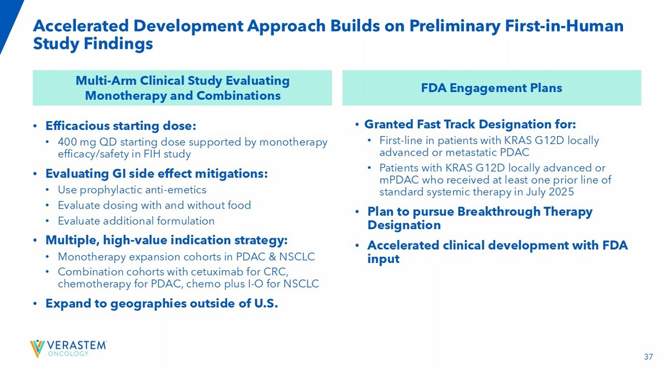 37 • Efficacious starting dose: • 400 mg QD starting dose supported by monotherapy efficacy/safety in FIH study • Evaluating GI side effect mitigations: • Use prophylactic anti - emetics • Evaluate dosing with and without food • Evaluate additional formulation • Multiple, high - value indication strategy: • Monotherapy expansion cohorts in PDAC & NSCLC • Combination cohorts with cetuximab for CRC, chemotherapy for PDAC, chemo plus I - O for NSCLC • Expand to geographies outside of U.S. Accelerated Development Approach Builds on Preliminary First - in - Human Study Findings Multi - Arm Clinical Study Evaluating Monotherapy and Combinations FDA Engagement Plans • Granted Fast Track Designation for: • First - line in patients with KRAS G12D locally advanced or metastatic PDAC • Patients with KRAS G12D locally advanced or mPDAC who received at least one prior line of standard systemic therapy in July 2025 • Plan to pursue Breakthrough Therapy Designation • Accelerated clinical development with FDA input