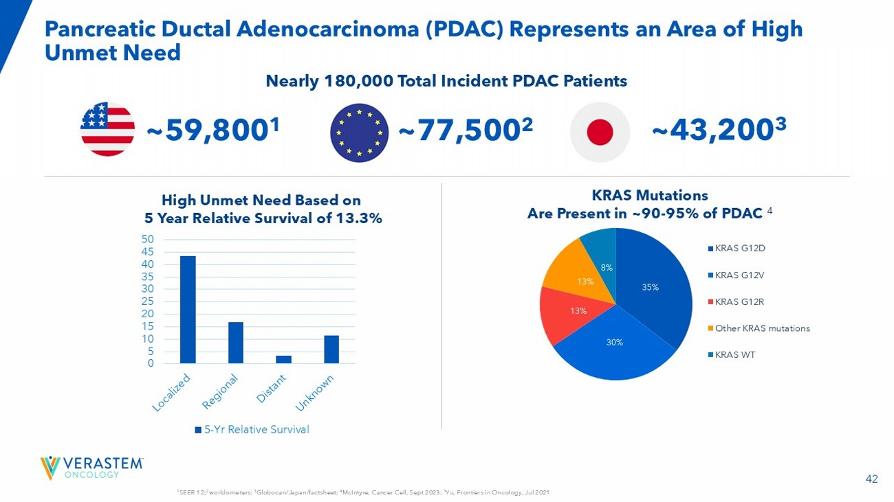 42 1 SEER 12; 2 worldometers; 3 Globocan/Japan/factsheet; 4 McIntyre, Cancer Cell, Sept 2023; 5 Yu, Frontiers in Oncology, Jul 2021 Pancreatic Ductal Adenocarcinoma (PDAC) Represents an Area of High Unmet Need 0 5 10 15 20 25 30 35 40 45 50 5-Yr Relative Survival KRAS Mutations Are Present in ~90 - 95% of PDAC 4 High Unmet Need Based on 5 Year Relative Survival of 13.3% Nearly 180,000 Total Incident PDAC Patients 35% 30% 13% 13% 8% KRAS G12D KRAS G12V KRAS G12R Other KRAS mutations KRAS WT ~59,800 1 ~43,200 3 ~77,500 2