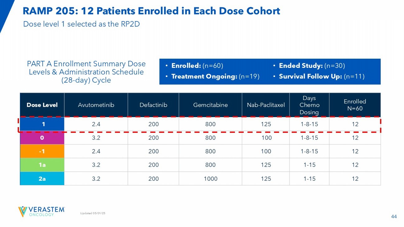 43 DLT: dose - limiting toxicity; RP2D: recommended phase 2 dose; CT: computed tomography; ECOG: European Cooperative Oncology Group; MRI: magnetic resonance imaging RAMP 205: Designed to Identify and Evaluate RP2D in Combination with Chemotherapy for Treatment of Newly Diagnosed mPDAC RAMP 205: Ongoing Phase 1/2 Evaluating Avutometinib + Defactinib with Gemcitabine and Nab - paclitaxel Inclusion Criteria • Histologic or cytologic confirmed mPDAC • Eligible for treatment in the first - line setting (no prior systemic therapy for advanced or metastatic disease) • Measurable by RECIST v1.1 by CT or MRI • ECOG Performance status of ≤1 • Part B only, adequate tissue sample to evaluate KRA mutational status Collaboration with PanCAN , NCT05669482 Part A: Dose Evaluation (3+3 DLT Assessment) RP2D Selection Part B: Dose Expansion (Primary Endpoint: ORR) Avutometinib + Defactinib + Gemcitabine + Nab - paclitaxel Dose Finding Cohorts n=3 - 6 Avutometinib + Defactinib + Gemcitabine + Nab - paclitaxel DLT - Cleared Dose Level Expansion • Patients with PDAC treated at RP2D • Stage 1: 17 patients if ≥7 responders, then • Simon’s 2 - stage design: expand to 29 patients Current status of trial
