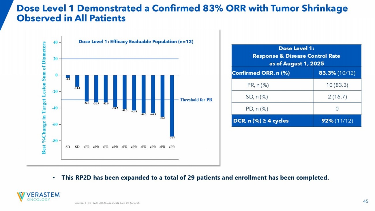 39 Source: Verastem press release Oct. 23, 2025; VSTM DOF VS - 7375 Clears Two Dose Levels, Demonstrates Promising Anti - Tumor Activity in Ongoing Phase 1/2a Trial Monotherapy Dose Escalation GI Adverse Events Combination Cohorts First two monotherapy dose levels (400 mg QD and 600 mg QD) cleared, with no dose - limiting toxicities reported No nausea, vomiting, or diarrhea greater than Grade 1 was observed in first two dose levels Enrollment initiated for VS - 7375 in combination with cetuximab in patients with advanced KRAS G12D mutant solid tumors, including colorectal cancer Anti - Tumor Activity Promising anti - tumor activity observed in patients with various solid tumors, including advanced pancreatic ductal adenocarcinoma