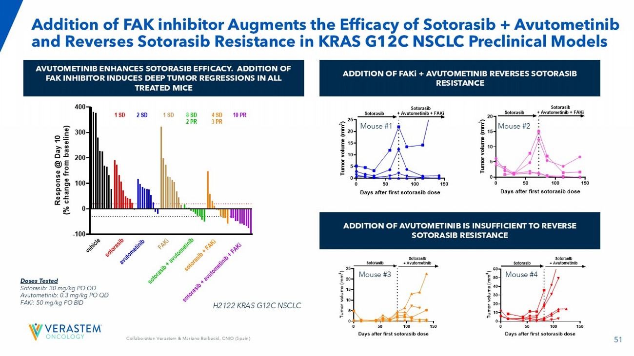 51 Collaboration Verastem & Mariano Barbacid , CNIO (Spain) Addition of FAK inhibitor Augments the Efficacy of Sotorasib + Avutometinib and Reverses Sotorasib Resistance in KRAS G12C NSCLC Preclinical Models AVUTOMETINIB ENHANCES SOTORASIB EFFICACY. ADDITION OF FAK INHIBITOR INDUCES DEEP TUMOR REGRESSIONS IN ALL TREATED MICE ADDITION OF FAKi + AVUTOMETINIB REVERSES SOTORASIB RESISTANCE ADDITION OF AVUTOMETINIB IS INSUFFICIENT TO REVERSE SOTORASIB RESISTANCE -100 0 100 200 300 400 Response at Day 10 R e s p o n s e @ D a y 1 0 ( % c h a n g e f r o m b a s e l i n e ) v e h i c l e 10 PR a v u t o m e t i n i b F A K i s o t o r a s i b s o t o r a s i b + a v u t o m e t i n i b s o t o r a s i b + F A K i s o t o r a s i b + a v u t o m e t i n i b + F A K i 2 SD 1 SD1 SD 8 SD 2 PR 4 SD 3 PR Doses Tested Sotorasib : 30 mg/kg PO QD Avutometinib : 0.3 mg/kg PO QD FAKi : 50 mg/kg PO BID H2122 KRAS G12C NSCLC 0 50 100 150 0 5 10 15 20 25 Days after first sotorasib dose T u m o r v o l u m e ( m m 3 ) Sotorasib + Avutometinib + FAKiSotorasib 0 50 100 150 0 5 10 15 20 25 Days after first sotorasib dose T u m o r v o l u m e ( m m 3 ) Sotorasib + Avutometinib Sotorasib Mouse #1 Mouse #2 Mouse #3 Mouse #4