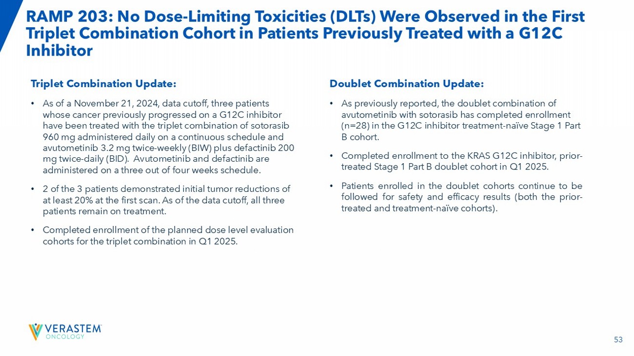 53 RAMP 203: No Dose - Limiting Toxicities (DLTs) Were Observed in the First Triplet Combination Cohort in Patients Previously Treated with a G12C Inhibitor Triplet Combination Update: • As of a November 21, 2024, data cutoff, three patients whose cancer previously progressed on a G12C inhibitor have been treated with the triplet combination of sotorasib 960 mg administered daily on a continuous schedule and avutometinib 3.2 mg twice - weekly (BIW) plus defactinib 200 mg twice - daily (BID). Avutometinib and defactinib are administered on a three out of four weeks schedule. • 2 of the 3 patients demonstrated initial tumor reductions of at least 20% at the first scan. As of the data cutoff, all three patients remain on treatment. • Completed enrollment of the planned dose level evaluation cohorts for the triplet combination in Q1 2025. Doublet Combination Update: • As previously reported, the doublet combination of avutometinib with sotorasib has completed enrollment (n=28) in the G12C inhibitor treatment - naïve Stage 1 Part B cohort. • Completed enrollment to the KRAS G 12 C inhibitor, prior - treated Stage 1 Part B doublet cohort in Q 1 2025 . • Patients enrolled in the doublet cohorts continue to be followed for safety and efficacy results (both the prior - treated and treatment - naïve cohorts) .