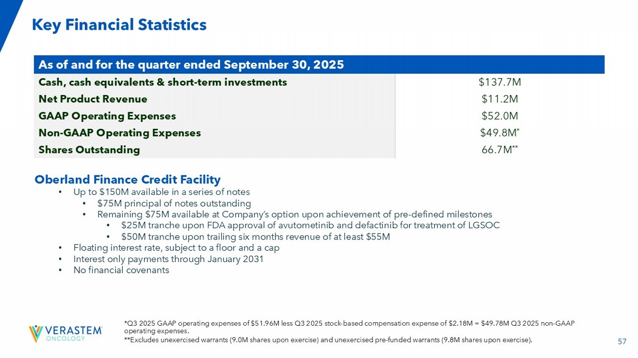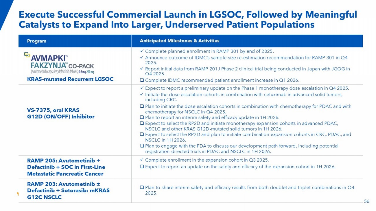 56 Execute Successful Commercial Launch in LGSOC, Followed by Meaningful Catalysts to Expand Into Larger, Underserved Patient Populations Anticipated Milestones & Activities Program x Complete planned enrollment in RAMP 301 by end of 2025. x Announce outcome of IDMC’s sample - size re - estimation recommendation for RAMP 301 in Q4 2025. x Report initial data from RAMP 201J Phase 2 clinical trial being conducted in Japan with JGOG in Q4 2025. □ Complete IDMC recommended patient enrollment increase in Q1 2026 . KRAS - mutated Recurrent LGSOC x Expect to report a preliminary update on the Phase 1 monotherapy dose escalation in Q4 2025. x Initiate the dose escalation cohorts in combination with cetuximab in advanced solid tumors, including CRC. □ Plan to initiate the dose escalation cohorts in combination with chemotherapy for PDAC and with chemotherapy for NSCLC in Q4 2025. □ Plan to report an interim safety and efficacy update in 1H 2026. □ Expect to select the RP2D and i nitiate monotherapy expansion cohorts in advanced PDAC, NSCLC and other KRAS G12D - mutated solid tumors in 1H 2026. □ Expect to select the RP2D and plan to initiate combination expansion cohorts in CRC, PDAC, and NSCLC in 1H 2026. □ Plan to engage with the FDA to discuss our development path forward , including potential registration - directed trials in PDAC and NSCLC in 1H 2026 . x Complete enrollment in the expansion cohort in Q3 2025. □ Expect to report an update on the safety and efficacy of the expansion cohort in 1H 2026. RAMP 205: Avutometinib + Defactinib + SOC in First - Line Metastatic Pancreatic Cancer □ Plan to share interim safety and efficacy results from both doublet and triplet combinations in Q 4 2025 . RAMP 203: Avutometinib ± Defactinib + Sotorasib: mKRAS G12C NSCLC VS - 7375, oral KRAS G12D (ON/OFF) Inhibitor