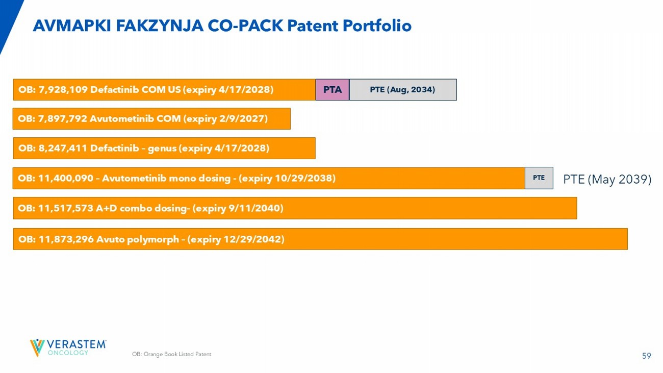 59 OB: Orange Book Listed Patent AVMAPKI FAKZYNJA CO - PACK Patent Portfolio OB: 7,897,792 Avutometinib COM (expiry 2/9/2027) OB: 11,400,090 – Avutometinib mono dosing - (expiry 10/29/2038) PTE OB: 7,928,109 Defactinib COM US (expiry 4/17/2028) PTA PTE (Aug, 2034) OB: 8,247,411 Defactinib – genus (expiry 4/17/2028) OB: 11,517,573 A+D combo dosing – (expiry 9/11/2040) OB: 11,873,296 Avuto polymorph – (expiry 12/29/2042) PTE (May 2039)