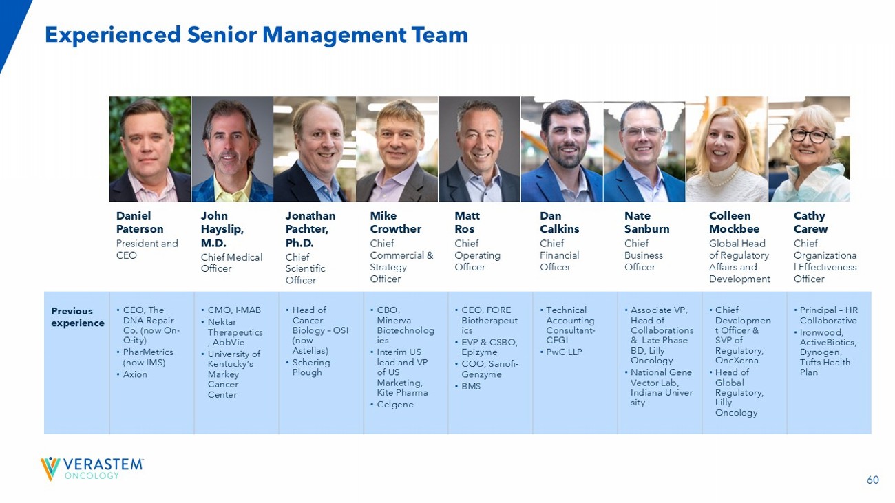 60 Experienced Senior Management Team Cathy Carew Chief Organizationa l Effectiveness Officer Colleen Mockbee Global Head of Regulatory Affairs and Development Nate Sanburn Chief Business Officer Dan Calkins Chief Financial Officer Matt Ros Chief Operating Officer Mike Crowther Chief Commercial & Strategy Officer Jonathan Pachter, Ph.D. Chief Scientific Officer John Hayslip, M.D. Chief Medical Officer Daniel Paterson President and CEO • Principal – HR Collaborative • Ironwood, ActiveBiotics , Dynogen , Tufts Health Plan • Chief Developmen t Officer & SVP of Regulatory, OncXerna • Head of Global Regulatory, Lilly Oncology • Associate VP, Head of Collaborations & Late Phase BD, Lilly Oncology • National Gene Vector Lab, Indiana Univer sity • Technical Accounting Consultant - CFGI • PwC LLP • CEO, FORE Biotherapeut ics • EVP & CSBO, Epizyme • COO, Sanofi - Genzyme • BMS • CBO, Minerva Biotechnolog ies • Interim US lead and VP of US Marketing, Kite Pharma • Celgene • Head of Cancer Biology – OSI (now Astellas) • Schering - Plough • CMO, I - MAB • Nektar Therapeutics , AbbVie • University of Kentucky’s Markey Cancer Center • CEO, The DNA Repair Co. (now On - Q - ity ) • PharMetrics (now IMS) • Axion Previous experience