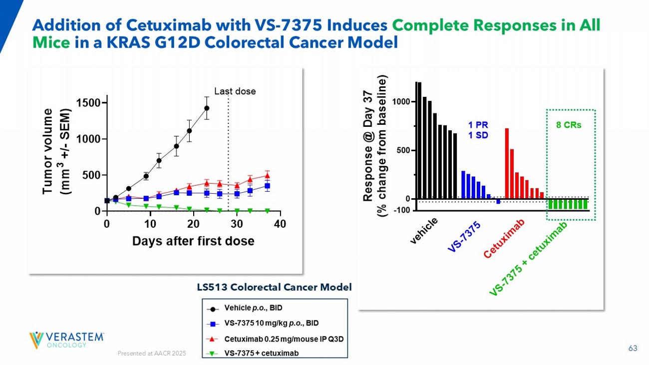 63 Addition of Cetuximab with VS - 7375 Induces Complete Responses in All Mice in a KRAS G12D Colorectal Cancer Model LS513 Colorectal Cancer Model 0 10 20 30 40 0 500 1000 1500 Tumor growth Days after first dose T u m o r v o l u m e ( m m 3 + / - S E M ) Vehicle GFH375 Cetuximab GFH375 + cetuximab Last dose 0 500 1000 R e s p o n s e @ D a y 3 7 ( % c h a n g e f r o m b a s e l i n e ) v e h i c l e V S - 7 3 7 5 C e t u x i m a b V S - 7 3 7 5 + c e t u x i m a b 1 PR 1 SD 8 CRs -100 Presented at AACR 2025