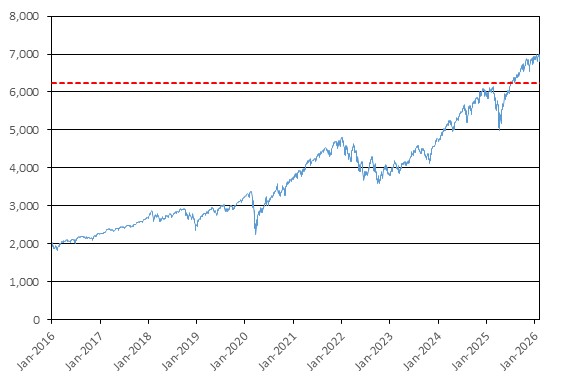 The graph below illustrates the performance of SPX from January 1, 2016 through February 6, 2026, based on the daily closing levels as reported by Bloomberg, without independent verification. UBS has not conducted any independent review or due diligence of any information obtained from Bloomberg. The closing level of SPX on February 6, 2026 was 6,932.30. The dotted line represents the downside threshold of 6,239.07, which is equal to 90.00% of the initial level. Past performance of the underlying asset is not indicative of the future performance of the underlying asset during the term of the Notes.