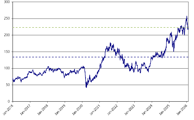 The graph below illustrates the performance of Capital One’s common stock from January 1, 2016 through February 6, 2026, based on the daily closing levels as reported by Bloomberg, without independent verification. UBS has not conducted any independent review or due diligence of any publicly available information obtained from Bloomberg. The closing level of Capital One’s common stock on February 6, 2026 was $222.79. The dotted lines respectively represent its call threshold level of $222.79, which is equal to 100.00% of its initial level, and its downside threshold of $133.67, which is equal to 60.00% of its initial level. Past performance of the underlying asset is not indicative of the future performance of the underlying asset during the term of the Notes.