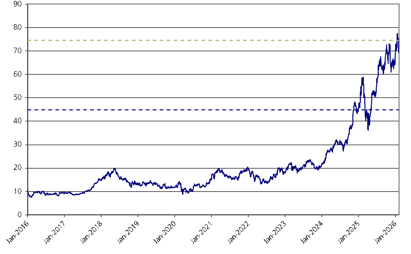 The graph below illustrates the performance of IBG’s common stock from January 1, 2016 through February 6, 2026, based on the daily closing levels as reported by Bloomberg, without independent verification. UBS has not conducted any independent review or due diligence of any publicly available information obtained from Bloomberg. The closing level of IBG’s common stock on February 6, 2026 was $74.59. The dotted lines respectively represent its call threshold level of $74.59, which is equal to 100.00% of its initial level, and its downside threshold of $44.75, which is equal to 60.00% of its initial level. Past performance of the underlying asset is not indicative of the future performance of the underlying asset during the term of the Notes.