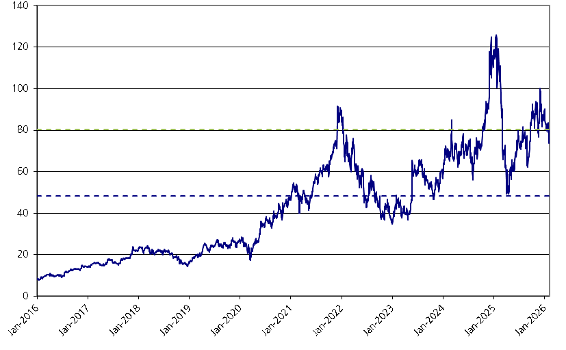 The graph below illustrates the performance of Marvell’s common stock from January 1, 2016 through February 6, 2026, based on the daily closing levels as reported by Bloomberg, without independent verification. UBS has not conducted any independent review or due diligence of any publicly available information obtained from Bloomberg. The closing level of Marvell’s common stock on February 6, 2026 was $80.28. The dotted lines respectively represent its call threshold level of $80.28, which is equal to 100.00% of its initial level, and its downside threshold of $48.17, which is equal to 60.00% of its hypothetical initial level. Past performance of the underlying asset is not indicative of the future performance of the underlying asset during the term of the Notes.