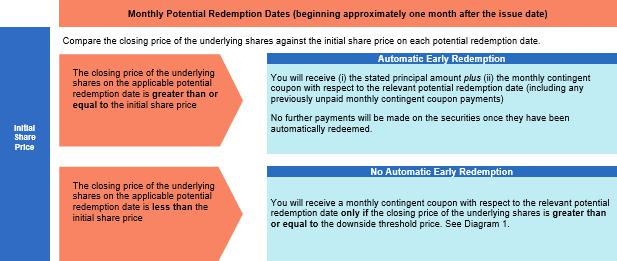 | Automatic early redemption: | If, on any potential redemption date, the closing price of the underlying shares on that date is greater than or equal to the initial share price, each security you then hold will be automatically redeemed on the related contingent coupon payment date for an amount in cash equal to the early redemption payment. If the securities are redeemed, no further payments will be made. |