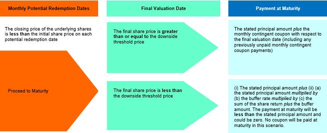 If the closing price of the underlying shares is greater than or equal to the initial share price on any potential redemption date (beginning approximately one month after the issue date), the securities will be automatically redeemed for an early redemption payment equal to the stated principal amount plus the monthly contingent coupon payment with respect to the related potential redemption date (including any previously unpaid monthly contingent coupon payments). If the securities have not previously been automatically redeemed and the final share price is greater than or equal to the downside threshold price, the payment at maturity will also be the sum of the stated principal amount and the monthly contingent coupon payment due at maturity (including any previously unpaid monthly contingent coupon payments). However, if the securities have not previously been automatically redeemed and the final share price is less than the downside threshold price, investors will be exposed to the decline in the closing price of the underlying shares, as compared to the initial share price, on a leveraged basis (and, in addition, will not receive any monthly contingent coupon payment at maturity, including any previously unpaid monthly contingent coupon payments). Under these circumstances, the payment at maturity will be (i) the stated principal amount plus (ii) (a) the stated principal amount times (b) the buffer rate times (c) the sum of the share return plus the buffer amount, which means that the payment at maturity will be less than the stated principal amount of the securities and could be zero. Investors in the securities must be willing to accept the risk of losing their entire principal and also the risk of receiving few or no monthly contingent coupon payments over the term of the securities. In addition, investors will not participate in any appreciation of the underlying shares.