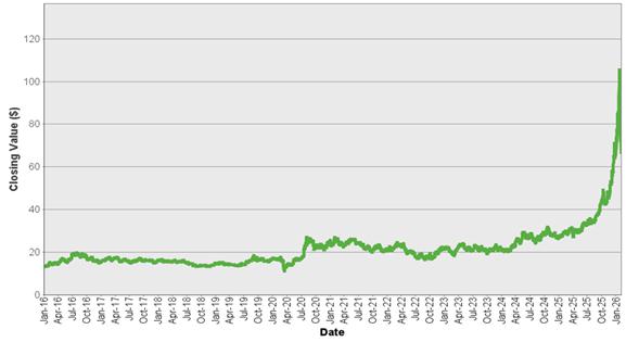 | iShares® Silver Trust – Historical Closing Values January 4, 2016 to February 5, 2026 |