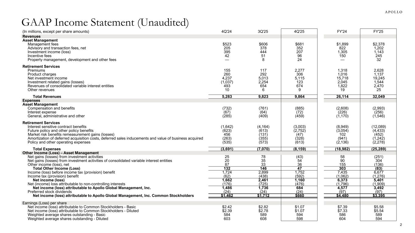 (In millions, except per share amounts) 4Q'24 3Q'25 4Q'25 FY'24 FY'25 Revenues Asset Management Management fees $523 $606 $681 $1,899 $2,378 Advisory and transaction fees, net 205 378 352 822 1,202 Investment income (loss) 395 444 207 1,305 1,143 Incentive fees 42 51 96 150 245 Property management, development and other fees — 8 24 — 32 Retirement Services Premiums 155 117 2,277 1,318 2,628 Product charges 260 292 306 1,016 1,137 Net investment income 4,237 5,013 5,115 15,718 19,245 Investment related gains (losses) (1,037) 2,254 123 2,045 1,544 Revenues of consolidated variable interest entities 493 654 674 1,822 2,470 Other revenues 10 6 9 19 25 Total Revenues 5,283 9,823 9,864 26,114 32,049 Expenses Asset Management Compensation and benefits (732) (761) (885) (2,608) (2,993) Interest expense (67) (64) (72) (226) (256) General, administrative and other (285) (409) (459) (1,170) (1,546) Retirement Services Interest sensitive contract benefits (1,642) (4,164) (3,003) (8,949) (12,089) Future policy and other policy benefits (623) (613) (2,752) (3,054) (4,433) Market risk benefits remeasurement gains (losses) 456 (131) (47) 102 (452) Amortization of deferred acquisition costs, deferred sales inducements and value of business acquired (263) (355) (328) (941) (1,242) Policy and other operating expenses (535) (573) (613) (2,136) (2,278) Total Expenses (3,691) (7,070) (8,159) (18,982) (25,289) Other Income (Loss) – Asset Management Net gains (losses) from investment activities 25 78 (43) 58 (251) Net gains (losses) from investment activities of consolidated variable interest entities 20 35 54 90 304 Other income (loss), net 87 33 36 155 (136) Total Other Income (Loss) 132 146 47 303 (83) Income (loss) before income tax (provision) benefit 1,724 2,899 1,752 7,435 6,677 Income tax (provision) benefit (62) (438) (592) (1,062) (1,276) Net income (loss) 1,662 2,461 1,160 6,373 5,401 Net (income) loss attributable to non-controlling interests (176) (725) (476) (1,796) (1,909) Net income (loss) attributable to Apollo Global Management, Inc. 1,486 1,736 684 4,577 3,492 Preferred stock dividends (24) (24) (24) (97) (97) Net income (loss) attributable to Apollo Global Management, Inc. Common Stockholders $1,462 $1,712 $660 $4,480 $3,395 Earnings (Loss) per share Net income (loss) attributable to Common Stockholders - Basic $2.42 $2.82 $1.07 $7.39 $5.58 Net income (loss) attributable to Common Stockholders - Diluted $2.39 $2.78 $1.07 $7.33 $5.54 Weighted average shares outstanding - Basic 584 589 594 586 589 Weighted average shares outstanding - Diluted 603 608 598 604 594 GAAP Income Statement (Unaudited) 2
