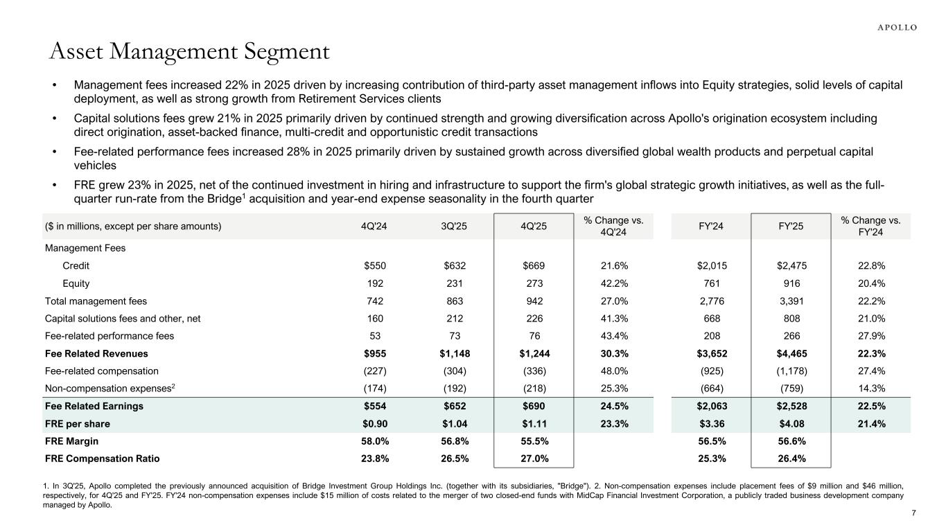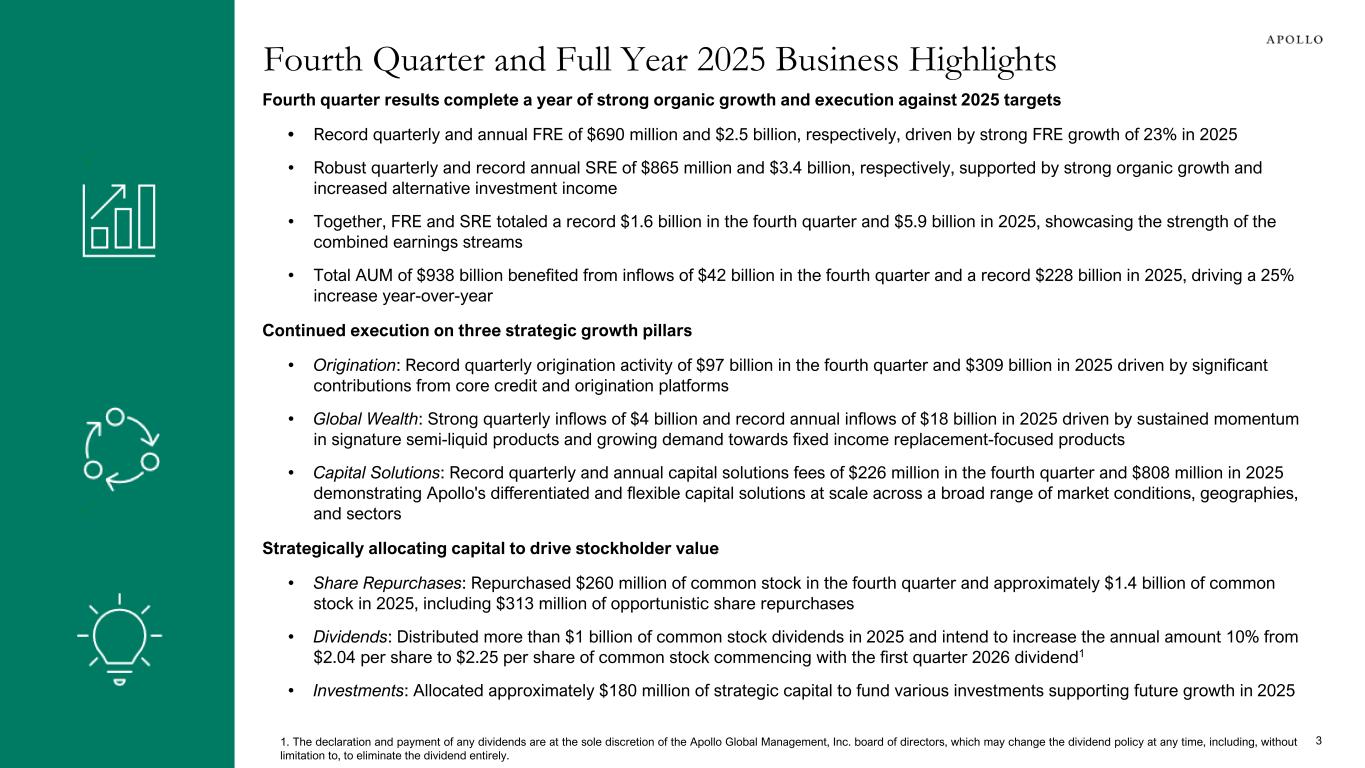Fourth quarter results complete a year of strong organic growth and execution against 2025 targets • Record quarterly and annual FRE of $690 million and $2.5 billion, respectively, driven by strong FRE growth of 23% in 2025 • Robust quarterly and record annual SRE of $865 million and $3.4 billion, respectively, supported by strong organic growth and increased alternative investment income • Together, FRE and SRE totaled a record $1.6 billion in the fourth quarter and $5.9 billion in 2025, showcasing the strength of the combined earnings streams • Total AUM of $938 billion benefited from inflows of $42 billion in the fourth quarter and a record $228 billion in 2025, driving a 25% increase year-over-year Continued execution on three strategic growth pillars • Origination: Record quarterly origination activity of $97 billion in the fourth quarter and $309 billion in 2025 driven by significant contributions from core credit and origination platforms • Global Wealth: Strong quarterly inflows of $4 billion and record annual inflows of $18 billion in 2025 driven by sustained momentum in signature semi-liquid products and growing demand towards fixed income replacement-focused products • Capital Solutions: Record quarterly and annual capital solutions fees of $226 million in the fourth quarter and $808 million in 2025 demonstrating Apollo's differentiated and flexible capital solutions at scale across a broad range of market conditions, geographies, and sectors Strategically allocating capital to drive stockholder value • Share Repurchases: Repurchased $260 million of common stock in the fourth quarter and approximately $1.4 billion of common stock in 2025, including $313 million of opportunistic share repurchases • Dividends: Distributed more than $1 billion of common stock dividends in 2025 and intend to increase the annual amount 10% from $2.04 per share to $2.25 per share of common stock commencing with the first quarter 2026 dividend1 • Investments: Allocated approximately $180 million of strategic capital to fund various investments supporting future growth in 2025 Fourth Quarter and Full Year 2025 Business Highlights ✓ ✓ 31. The declaration and payment of any dividends are at the sole discretion of the Apollo Global Management, Inc. board of directors, which may change the dividend policy at any time, including, without limitation to, to eliminate the dividend entirely.