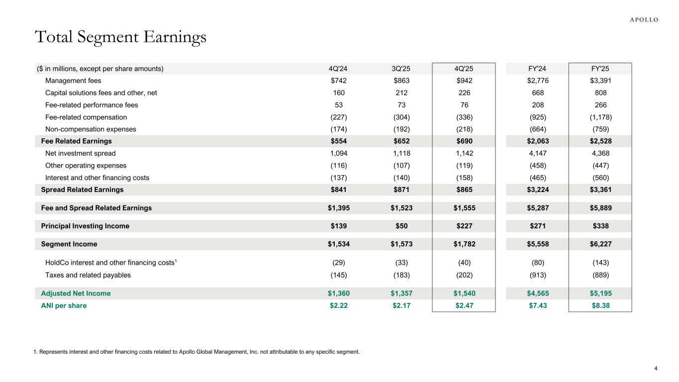 ($ in millions, except per share amounts) 4Q'24 3Q'25 4Q'25 FY'24 FY'25 Management fees $742 $863 $942 $2,776 $3,391 Capital solutions fees and other, net 160 212 226 668 808 Fee-related performance fees 53 73 76 208 266 Fee-related compensation (227) (304) (336) (925) (1,178) Non-compensation expenses (174) (192) (218) (664) (759) Fee Related Earnings $554 $652 $690 $2,063 $2,528 Net investment spread 1,094 1,118 1,142 4,147 4,368 Other operating expenses (116) (107) (119) (458) (447) Interest and other financing costs (137) (140) (158) (465) (560) Spread Related Earnings $841 $871 $865 $3,224 $3,361 Fee and Spread Related Earnings $1,395 $1,523 $1,555 $5,287 $5,889 Principal Investing Income $139 $50 $227 $271 $338 Segment Income $1,534 $1,573 $1,782 $5,558 $6,227 HoldCo interest and other financing costs1 (29) (33) (40) (80) (143) Taxes and related payables (145) (183) (202) (913) (889) Adjusted Net Income $1,360 $1,357 $1,540 $4,565 $5,195 ANI per share $2.22 $2.17 $2.47 $7.43 $8.38 1. Represents interest and other financing costs related to Apollo Global Management, Inc. not attributable to any specific segment. Total Segment Earnings 4