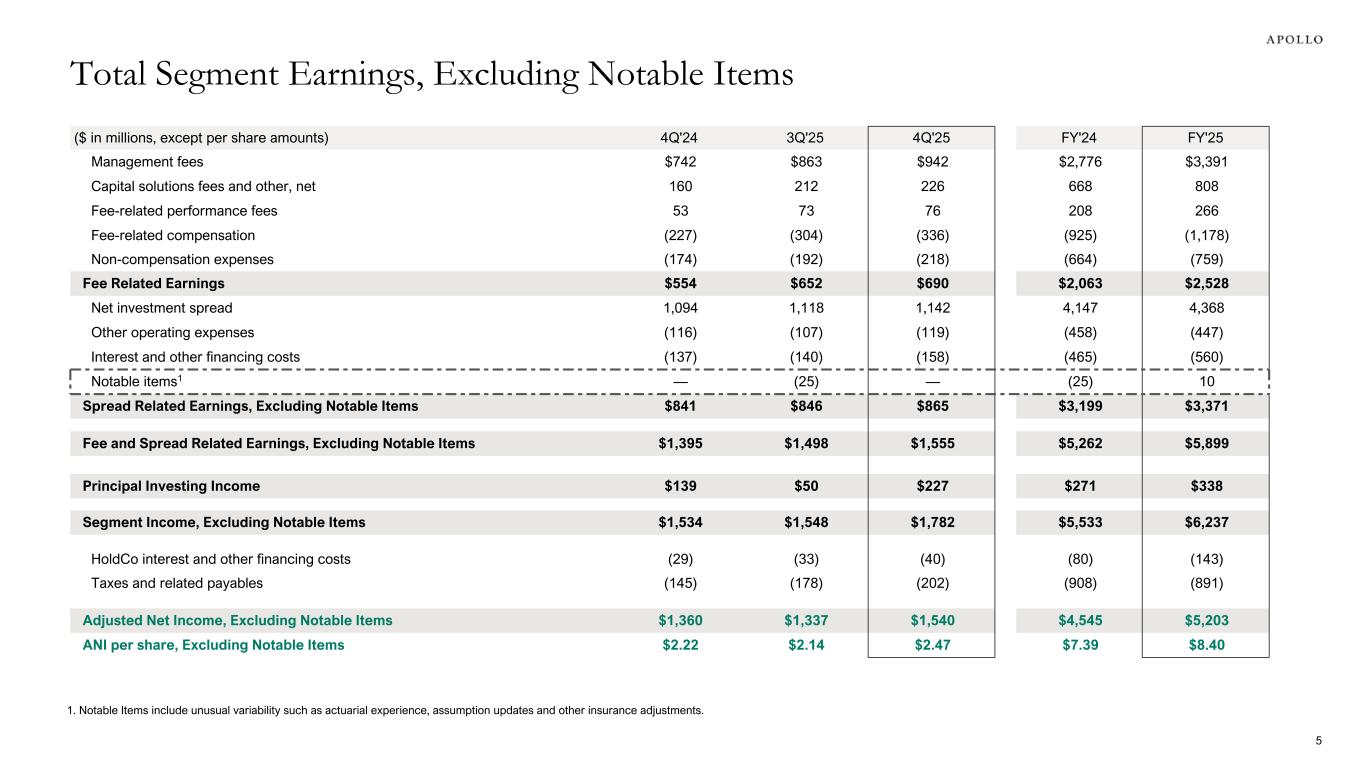 ($ in millions, except per share amounts) 4Q'24 3Q'25 4Q'25 FY'24 FY'25 Management fees $742 $863 $942 $2,776 $3,391 Capital solutions fees and other, net 160 212 226 668 808 Fee-related performance fees 53 73 76 208 266 Fee-related compensation (227) (304) (336) (925) (1,178) Non-compensation expenses (174) (192) (218) (664) (759) Fee Related Earnings $554 $652 $690 $2,063 $2,528 Net investment spread 1,094 1,118 1,142 4,147 4,368 Other operating expenses (116) (107) (119) (458) (447) Interest and other financing costs (137) (140) (158) (465) (560) Notable items1 — (25) — (25) 10 Spread Related Earnings, Excluding Notable Items $841 $846 $865 $3,199 $3,371 Fee and Spread Related Earnings, Excluding Notable Items $1,395 $1,498 $1,555 $5,262 $5,899 Principal Investing Income $139 $50 $227 $271 $338 Segment Income, Excluding Notable Items $1,534 $1,548 $1,782 $5,533 $6,237 HoldCo interest and other financing costs (29) (33) (40) (80) (143) Taxes and related payables (145) (178) (202) (908) (891) Adjusted Net Income, Excluding Notable Items $1,360 $1,337 $1,540 $4,545 $5,203 ANI per share, Excluding Notable Items $2.22 $2.14 $2.47 $7.39 $8.40 Total Segment Earnings, Excluding Notable Items 5 1. Notable Items include unusual variability such as actuarial experience, assumption updates and other insurance adjustments.