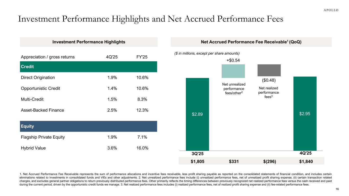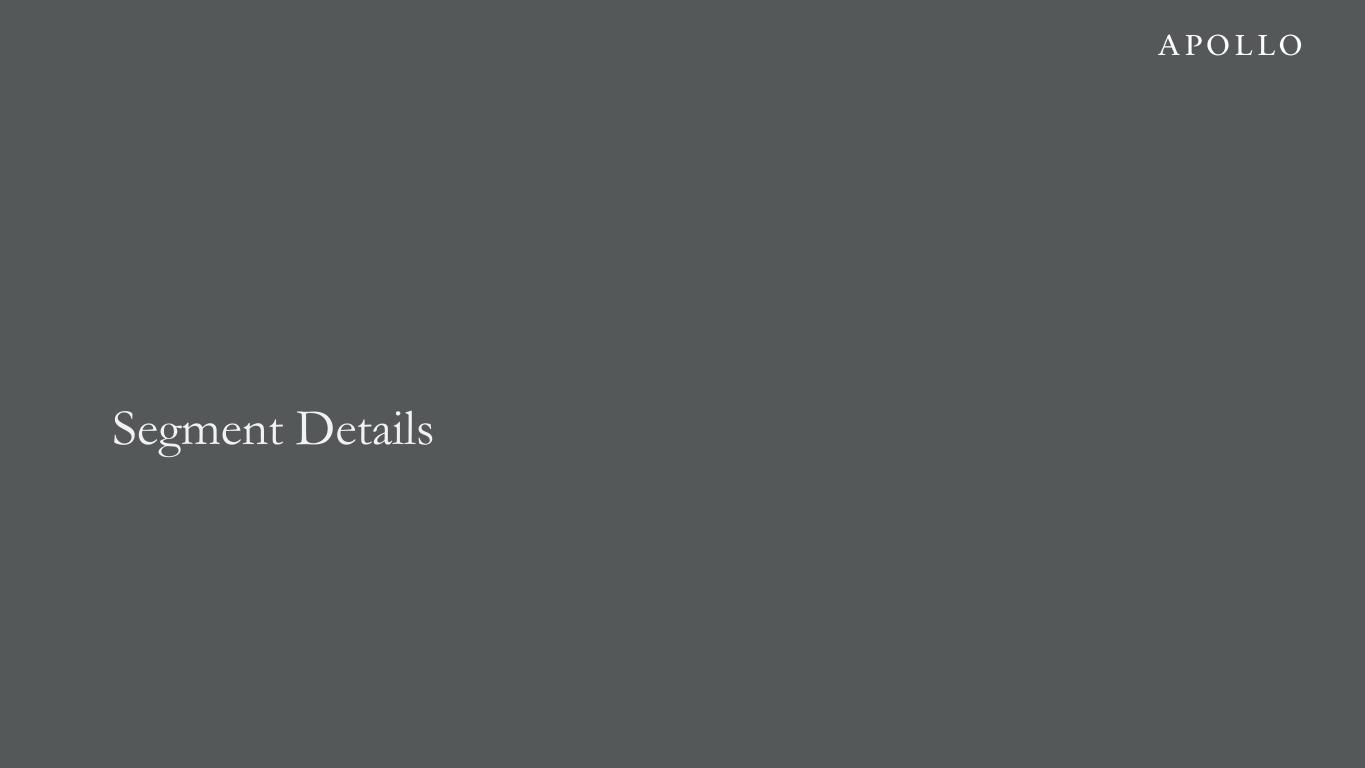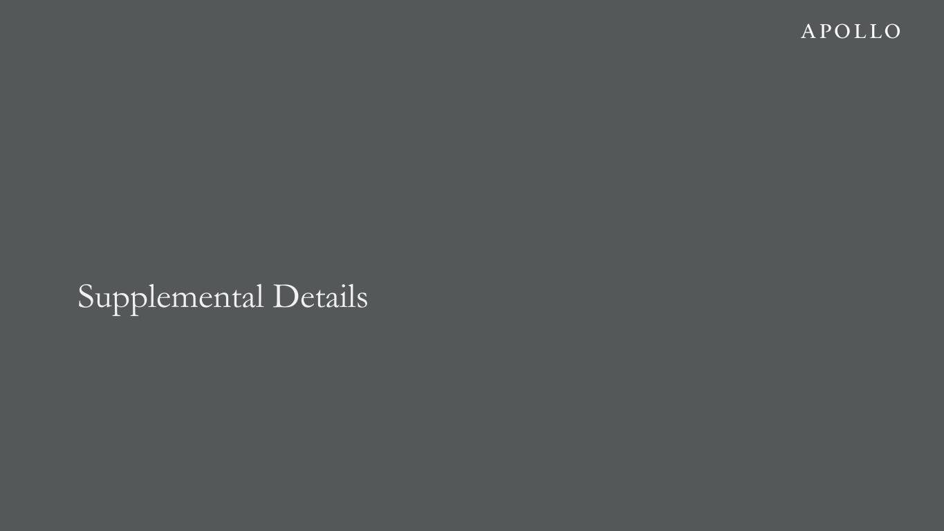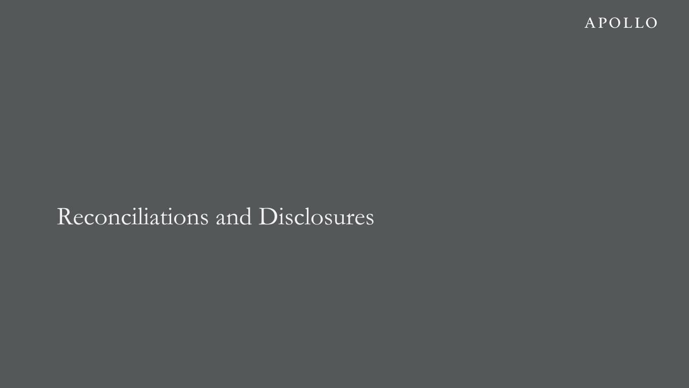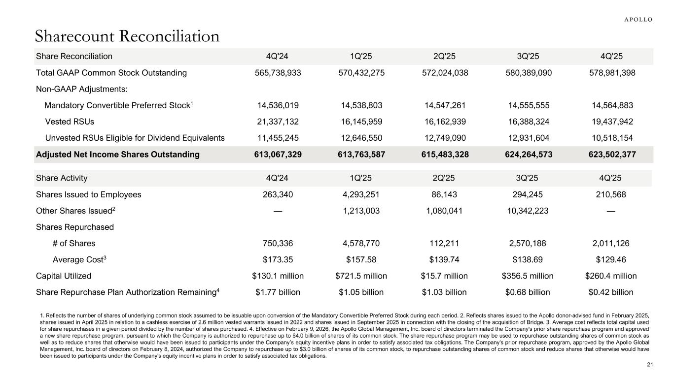 Share Reconciliation 4Q'24 1Q'25 2Q'25 3Q'25 4Q'25 Total GAAP Common Stock Outstanding 565,738,933 570,432,275 572,024,038 580,389,090 578,981,398 Non-GAAP Adjustments: Mandatory Convertible Preferred Stock1 14,536,019 14,538,803 14,547,261 14,555,555 14,564,883 Vested RSUs 21,337,132 16,145,959 16,162,939 16,388,324 19,437,942 Unvested RSUs Eligible for Dividend Equivalents 11,455,245 12,646,550 12,749,090 12,931,604 10,518,154 Adjusted Net Income Shares Outstanding 613,067,329 613,763,587 615,483,328 624,264,573 623,502,377 1. Reflects the number of shares of underlying common stock assumed to be issuable upon conversion of the Mandatory Convertible Preferred Stock during each period. 2. Reflects shares issued to the Apollo donor-advised fund in February 2025, shares issued in April 2025 in relation to a cashless exercise of 2.6 million vested warrants issued in 2022 and shares issued in September 2025 in connection with the closing of the acquisition of Bridge. 3. Average cost reflects total capital used for share repurchases in a given period divided by the number of shares purchased. 4. Effective on February 9, 2026, the Apollo Global Management, Inc. board of directors terminated the Company's prior share repurchase program and approved a new share repurchase program, pursuant to which the Company is authorized to repurchase up to $4.0 billion of shares of its common stock. The share repurchase program may be used to repurchase outstanding shares of common stock as well as to reduce shares that otherwise would have been issued to participants under the Company’s equity incentive plans in order to satisfy associated tax obligations. The Company's prior repurchase program, approved by the Apollo Global Management, Inc. board of directors on February 8, 2024, authorized the Company to repurchase up to $3.0 billion of shares of its common stock, to repurchase outstanding shares of common stock and reduce shares that otherwise would have been issued to participants under the Company's equity incentive plans in order to satisfy associated tax obligations. Share Activity 4Q'24 1Q'25 2Q'25 3Q'25 4Q'25 Shares Issued to Employees 263,340 4,293,251 86,143 294,245 210,568 Other Shares Issued2 — 1,213,003 1,080,041 10,342,223 — Shares Repurchased # of Shares 750,336 4,578,770 112,211 2,570,188 2,011,126 Average Cost3 $173.35 $157.58 $139.74 $138.69 $129.46 Capital Utilized $130.1 million $721.5 million $15.7 million $356.5 million $260.4 million Share Repurchase Plan Authorization Remaining4 $1.77 billion $1.05 billion $1.03 billion $0.68 billion $0.42 billion Sharecount Reconciliation 21