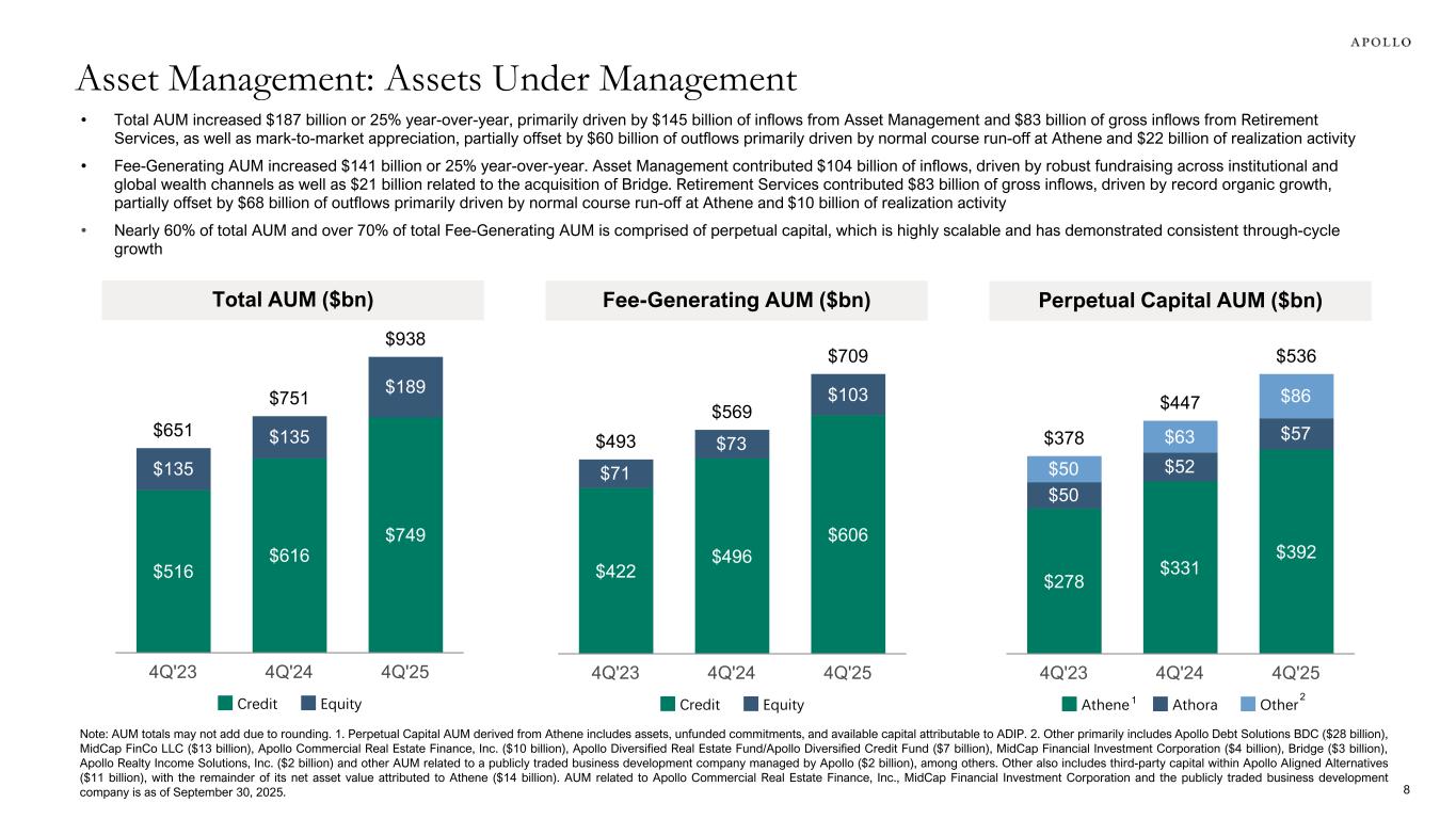 • Management fees increased 22% in 2025 driven by increasing contribution of third-party asset management inflows into Equity strategies, solid levels of capital deployment, as well as strong growth from Retirement Services clients • Capital solutions fees grew 21% in 2025 primarily driven by continued strength and growing diversification across Apollo's origination ecosystem including direct origination, asset-backed finance, multi-credit and opportunistic credit transactions • Fee-related performance fees increased 28% in 2025 primarily driven by sustained growth across diversified global wealth products and perpetual capital vehicles • FRE grew 23% in 2025, net of the continued investment in hiring and infrastructure to support the firm's global strategic growth initiatives, as well as the full- quarter run-rate from the Bridge1 acquisition and year-end expense seasonality in the fourth quarter ($ in millions, except per share amounts) 4Q'24 3Q'25 4Q'25 % Change vs. 4Q'24 FY'24 FY'25 % Change vs. FY'24 Management Fees Credit $550 $632 $669 21.6% $2,015 $2,475 22.8% Equity 192 231 273 42.2% 761 916 20.4% Total management fees 742 863 942 27.0% 2,776 3,391 22.2% Capital solutions fees and other, net 160 212 226 41.3% 668 808 21.0% Fee-related performance fees 53 73 76 43.4% 208 266 27.9% Fee Related Revenues $955 $1,148 $1,244 30.3% $3,652 $4,465 22.3% Fee-related compensation (227) (304) (336) 48.0% (925) (1,178) 27.4% Non-compensation expenses2 (174) (192) (218) 25.3% (664) (759) 14.3% Fee Related Earnings $554 $652 $690 24.5% $2,063 $2,528 22.5% FRE per share $0.90 $1.04 $1.11 23.3% $3.36 $4.08 21.4% FRE Margin 58.0% 56.8% 55.5% 56.5% 56.6% FRE Compensation Ratio 23.8% 26.5% 27.0% 25.3% 26.4% Asset Management Segment 1. In 3Q'25, Apollo completed the previously announced acquisition of Bridge Investment Group Holdings Inc. (together with its subsidiaries, "Bridge"). 2. Non-compensation expenses include placement fees of $9 million and $46 million, respectively, for 4Q'25 and FY'25. FY'24 non-compensation expenses include $15 million of costs related to the merger of two closed-end funds with MidCap Financial Investment Corporation, a publicly traded business development company managed by Apollo. 7