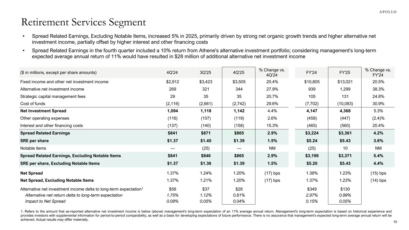• Spread Related Earnings, Excluding Notable Items, increased 5% in 2025, primarily driven by strong net organic growth trends and higher alternative net investment income, partially offset by higher interest and other financing costs • Spread Related Earnings in the fourth quarter included a 10% return from Athene's alternative investment portfolio; considering management's long-term expected average annual return of 11% would have resulted in $28 million of additional alternative net investment income 1. Refers to the amount that as-reported alternative net investment income is below (above) management's long-term expectation of an 11% average annual return. Management's long-term expectation is based on historical experience and provides investors with supplemental information for period-to-period comparability, as well as a basis for developing expectations of future performance. There is no assurance that management's expected long-term average annual return will be achieved. Actual results may differ materially. ($ in millions, except per share amounts) 4Q'24 3Q'25 4Q'25 % Change vs. 4Q'24 FY'24 FY'25 % Change vs. FY'24 Fixed income and other net investment income $2,912 $3,423 $3,505 20.4% $10,805 $13,021 20.5% Alternative net investment income 269 321 344 27.9% 939 1,299 38.3% Strategic capital management fees 29 35 35 20.7% 105 131 24.8% Cost of funds (2,116) (2,661) (2,742) 29.6% (7,702) (10,083) 30.9% Net Investment Spread 1,094 1,118 1,142 4.4% 4,147 4,368 5.3% Other operating expenses (116) (107) (119) 2.6% (458) (447) (2.4)% Interest and other financing costs (137) (140) (158) 15.3% (465) (560) 20.4% Spread Related Earnings $841 $871 $865 2.9% $3,224 $3,361 4.2% SRE per share $1.37 $1.40 $1.39 1.5% $5.24 $5.43 3.6% Notable items — (25) — NM (25) 10 NM Spread Related Earnings, Excluding Notable Items $841 $846 $865 2.9% $3,199 $3,371 5.4% SRE per share, Excluding Notable Items $1.37 $1.36 $1.39 1.5% $5.20 $5.43 4.4% Net Spread 1.37% 1.24% 1.20% (17) bps 1.38% 1.23% (15) bps Net Spread, Excluding Notable Items 1.37% 1.21% 1.20% (17) bps 1.37% 1.23% (14) bps Alternative net investment income delta to long-term expectation1 $58 $37 $28 $349 $130 Alternative net return delta to long-term expectation 1.75% 1.12% 0.81% 2.97% 0.99% Impact to Net Spread 0.09% 0.05% 0.04% 0.15% 0.05% Retirement Services Segment 10
