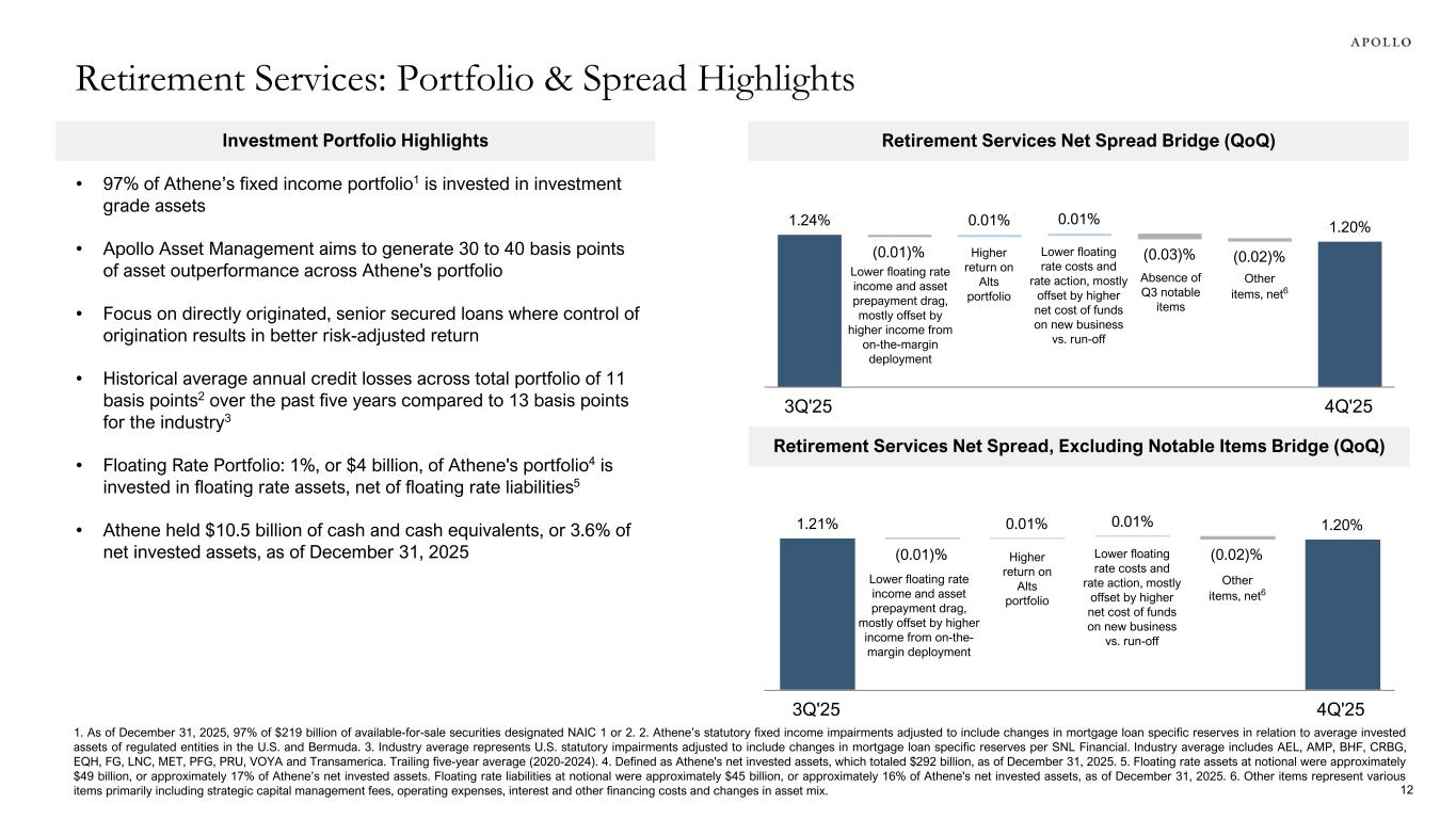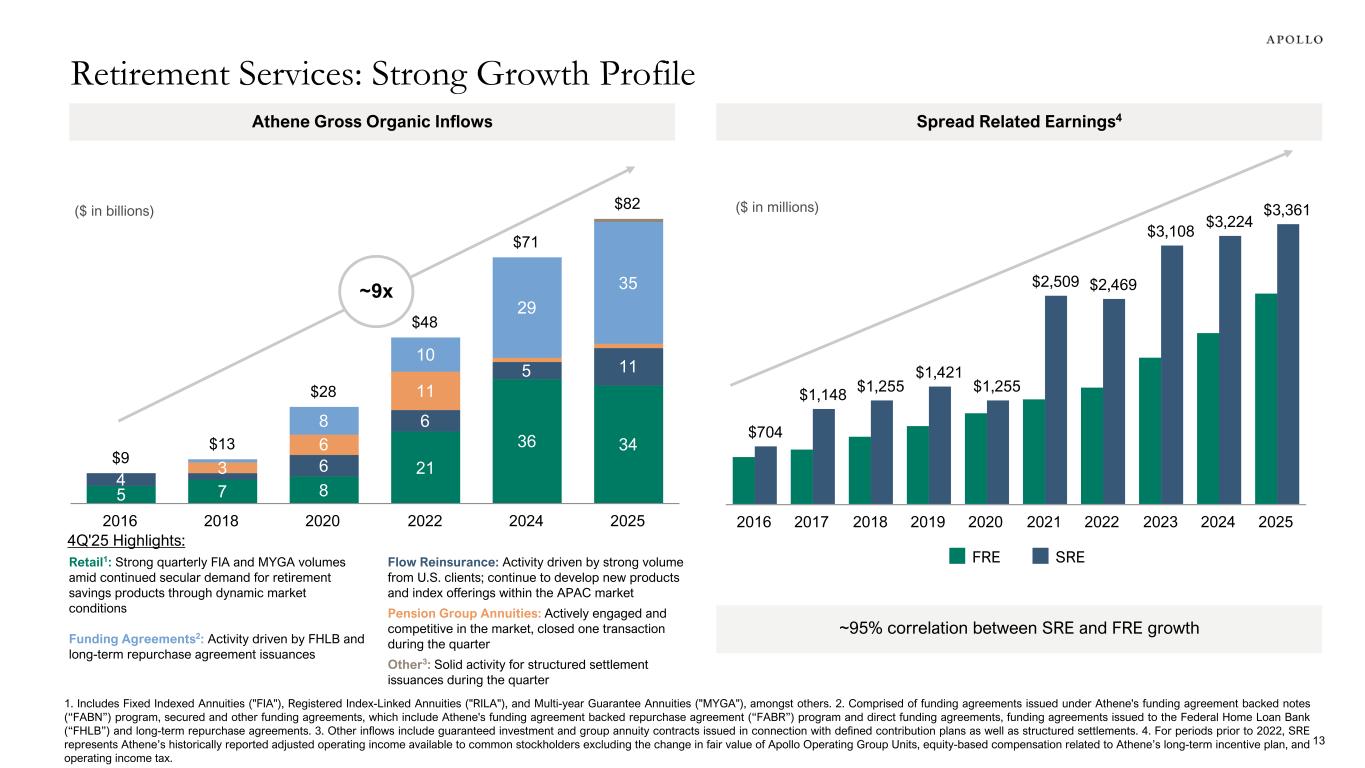 1.24% (0.01)% 0.01% 0.01% (0.03)% (0.02)% 1.20% 3Q'25 4Q'25 Investment Portfolio Highlights Retirement Services: Portfolio & Spread Highlights 12 Retirement Services Net Spread Bridge (QoQ) 1. As of December 31, 2025, 97% of $219 billion of available-for-sale securities designated NAIC 1 or 2. 2. Athene’s statutory fixed income impairments adjusted to include changes in mortgage loan specific reserves in relation to average invested assets of regulated entities in the U.S. and Bermuda. 3. Industry average represents U.S. statutory impairments adjusted to include changes in mortgage loan specific reserves per SNL Financial. Industry average includes AEL, AMP, BHF, CRBG, EQH, FG, LNC, MET, PFG, PRU, VOYA and Transamerica. Trailing five-year average (2020-2024). 4. Defined as Athene's net invested assets, which totaled $292 billion, as of December 31, 2025. 5. Floating rate assets at notional were approximately $49 billion, or approximately 17% of Athene’s net invested assets. Floating rate liabilities at notional were approximately $45 billion, or approximately 16% of Athene's net invested assets, as of December 31, 2025. 6. Other items represent various items primarily including strategic capital management fees, operating expenses, interest and other financing costs and changes in asset mix. • 97% of Athene’s fixed income portfolio1 is invested in investment grade assets • Apollo Asset Management aims to generate 30 to 40 basis points of asset outperformance across Athene's portfolio • Focus on directly originated, senior secured loans where control of origination results in better risk-adjusted return • Historical average annual credit losses across total portfolio of 11 basis points2 over the past five years compared to 13 basis points for the industry3 • Floating Rate Portfolio: 1%, or $4 billion, of Athene's portfolio4 is invested in floating rate assets, net of floating rate liabilities5 • Athene held $10.5 billion of cash and cash equivalents, or 3.6% of net invested assets, as of December 31, 2025 1.21% (0.01)% 0.01% 0.01% (0.02)% 1.20% 3Q'25 4Q'25 Retirement Services Net Spread, Excluding Notable Items Bridge (QoQ) Other items, net6 Other items, net6 Higher return on Alts portfolio Higher return on Alts portfolio Lower floating rate income and asset prepayment drag, mostly offset by higher income from on-the-margin deployment Lower floating rate costs and rate action, mostly offset by higher net cost of funds on new business vs. run-off Lower floating rate income and asset prepayment drag, mostly offset by higher income from on-the- margin deployment Absence of Q3 notable items Lower floating rate costs and rate action, mostly offset by higher net cost of funds on new business vs. run-off