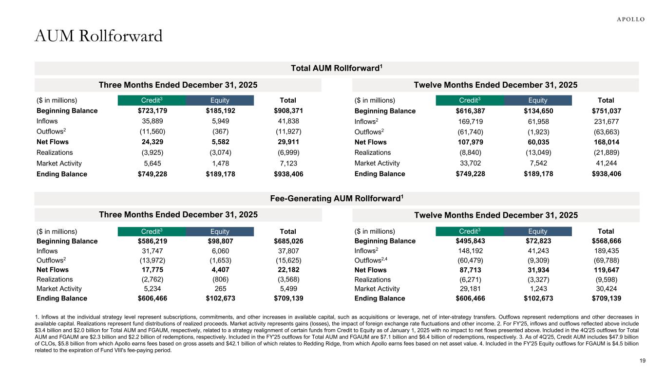 ($ in millions) Credit3 Equity Total Beginning Balance $723,179 $185,192 $908,371 Inflows 35,889 5,949 41,838 Outflows2 (11,560) (367) (11,927) Net Flows 24,329 5,582 29,911 Realizations (3,925) (3,074) (6,999) Market Activity 5,645 1,478 7,123 Ending Balance $749,228 $189,178 $938,406 Three Months Ended December 31, 2025 ($ in millions) Credit3 Equity Total Beginning Balance $616,387 $134,650 $751,037 Inflows2 169,719 61,958 231,677 Outflows2 (61,740) (1,923) (63,663) Net Flows 107,979 60,035 168,014 Realizations (8,840) (13,049) (21,889) Market Activity 33,702 7,542 41,244 Ending Balance $749,228 $189,178 $938,406 Twelve Months Ended December 31, 2025 ($ in millions) Credit3 Equity Total Beginning Balance $586,219 $98,807 $685,026 Inflows 31,747 6,060 37,807 Outflows2 (13,972) (1,653) (15,625) Net Flows 17,775 4,407 22,182 Realizations (2,762) (806) (3,568) Market Activity 5,234 265 5,499 Ending Balance $606,466 $102,673 $709,139 ($ in millions) Credit3 Equity Total Beginning Balance $495,843 $72,823 $568,666 Inflows2 148,192 41,243 189,435 Outflows2,4 (60,479) (9,309) (69,788) Net Flows 87,713 31,934 119,647 Realizations (6,271) (3,327) (9,598) Market Activity 29,181 1,243 30,424 Ending Balance $606,466 $102,673 $709,139 Twelve Months Ended December 31, 2025 Fee-Generating AUM Rollforward1 Total AUM Rollforward1 1. Inflows at the individual strategy level represent subscriptions, commitments, and other increases in available capital, such as acquisitions or leverage, net of inter-strategy transfers. Outflows represent redemptions and other decreases in available capital. Realizations represent fund distributions of realized proceeds. Market activity represents gains (losses), the impact of foreign exchange rate fluctuations and other income. 2. For FY'25, inflows and outflows reflected above include $3.4 billion and $2.0 billion for Total AUM and FGAUM, respectively, related to a strategy realignment of certain funds from Credit to Equity as of January 1, 2025 with no impact to net flows presented above. Included in the 4Q'25 outflows for Total AUM and FGAUM are $2.3 billion and $2.2 billion of redemptions, respectively. Included in the FY'25 outflows for Total AUM and FGAUM are $7.1 billion and $6.4 billion of redemptions, respectively. 3. As of 4Q'25, Credit AUM includes $47.9 billion of CLOs, $5.8 billion from which Apollo earns fees based on gross assets and $42.1 billion of which relates to Redding Ridge, from which Apollo earns fees based on net asset value. 4. Included in the FY'25 Equity outflows for FGAUM is $4.5 billion related to the expiration of Fund VIII's fee-paying period. AUM Rollforward 19 Three Months Ended December 31, 2025