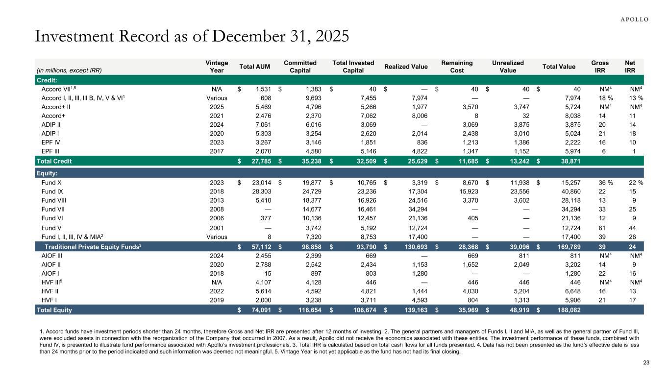 (in millions, except IRR) Vintage Year Total AUM Committed Capital Total Invested Capital Realized Value Remaining Cost Unrealized Value Total Value Gross IRR Net IRR Credit: Accord VII1,5 N/A $ 1,531 $ 1,383 $ 40 $ — $ 40 $ 40 $ 40 NM4 NM4 Accord I, II, III, III B, IV, V & VI1 Various 608 9,693 7,455 7,974 — — 7,974 18 % 13 % Accord+ II 2025 5,469 4,796 5,266 1,977 3,570 3,747 5,724 NM4 NM4 Accord+ 2021 2,476 2,370 7,062 8,006 8 32 8,038 14 11 ADIP II 2024 7,061 6,016 3,069 — 3,069 3,875 3,875 20 14 ADIP I 2020 5,303 3,254 2,620 2,014 2,438 3,010 5,024 21 18 EPF IV 2023 3,267 3,146 1,851 836 1,213 1,386 2,222 16 10 EPF III 2017 2,070 4,580 5,146 4,822 1,347 1,152 5,974 6 1 Total Credit $ 27,785 $ 35,238 $ 32,509 $ 25,629 $ 11,685 $ 13,242 $ 38,871 Equity: Fund X 2023 $ 23,014 $ 19,877 $ 10,765 $ 3,319 $ 8,670 $ 11,938 $ 15,257 36 % 22 % Fund IX 2018 28,303 24,729 23,236 17,304 15,923 23,556 40,860 22 15 Fund VIII 2013 5,410 18,377 16,926 24,516 3,370 3,602 28,118 13 9 Fund VII 2008 — 14,677 16,461 34,294 — — 34,294 33 25 Fund VI 2006 377 10,136 12,457 21,136 405 — 21,136 12 9 Fund V 2001 — 3,742 5,192 12,724 — — 12,724 61 44 Fund I, II, III, IV & MIA2 Various 8 7,320 8,753 17,400 — — 17,400 39 26 Traditional Private Equity Funds3 $ 57,112 $ 98,858 $ 93,790 $ 130,693 $ 28,368 $ 39,096 $ 169,789 39 24 AIOF III 2024 2,455 2,399 669 — 669 811 811 NM4 NM4 AIOF II 2020 2,788 2,542 2,434 1,153 1,652 2,049 3,202 14 9 AIOF I 2018 15 897 803 1,280 — — 1,280 22 16 HVF III5 N/A 4,107 4,128 446 — 446 446 446 NM4 NM4 HVF II 2022 5,614 4,592 4,821 1,444 4,030 5,204 6,648 16 13 HVF I 2019 2,000 3,238 3,711 4,593 804 1,313 5,906 21 17 Total Equity $ 74,091 $ 116,654 $ 106,674 $ 139,163 $ 35,969 $ 48,919 $ 188,082 Investment Record as of December 31, 2025 23 1. Accord funds have investment periods shorter than 24 months, therefore Gross and Net IRR are presented after 12 months of investing. 2. The general partners and managers of Funds I, II and MIA, as well as the general partner of Fund III, were excluded assets in connection with the reorganization of the Company that occurred in 2007. As a result, Apollo did not receive the economics associated with these entities. The investment performance of these funds, combined with Fund IV, is presented to illustrate fund performance associated with Apollo’s investment professionals. 3. Total IRR is calculated based on total cash flows for all funds presented. 4. Data has not been presented as the fund’s effective date is less than 24 months prior to the period indicated and such information was deemed not meaningful. 5. Vintage Year is not yet applicable as the fund has not had its final closing.