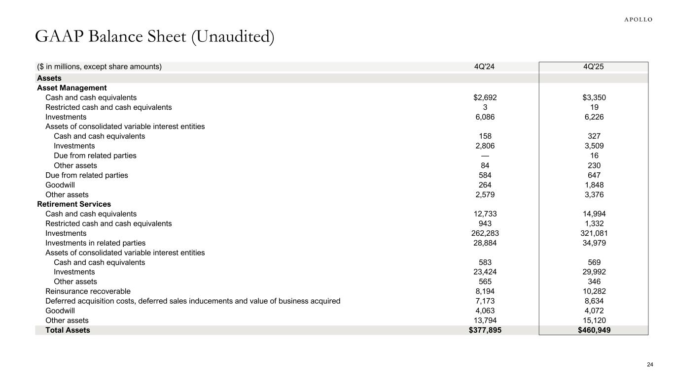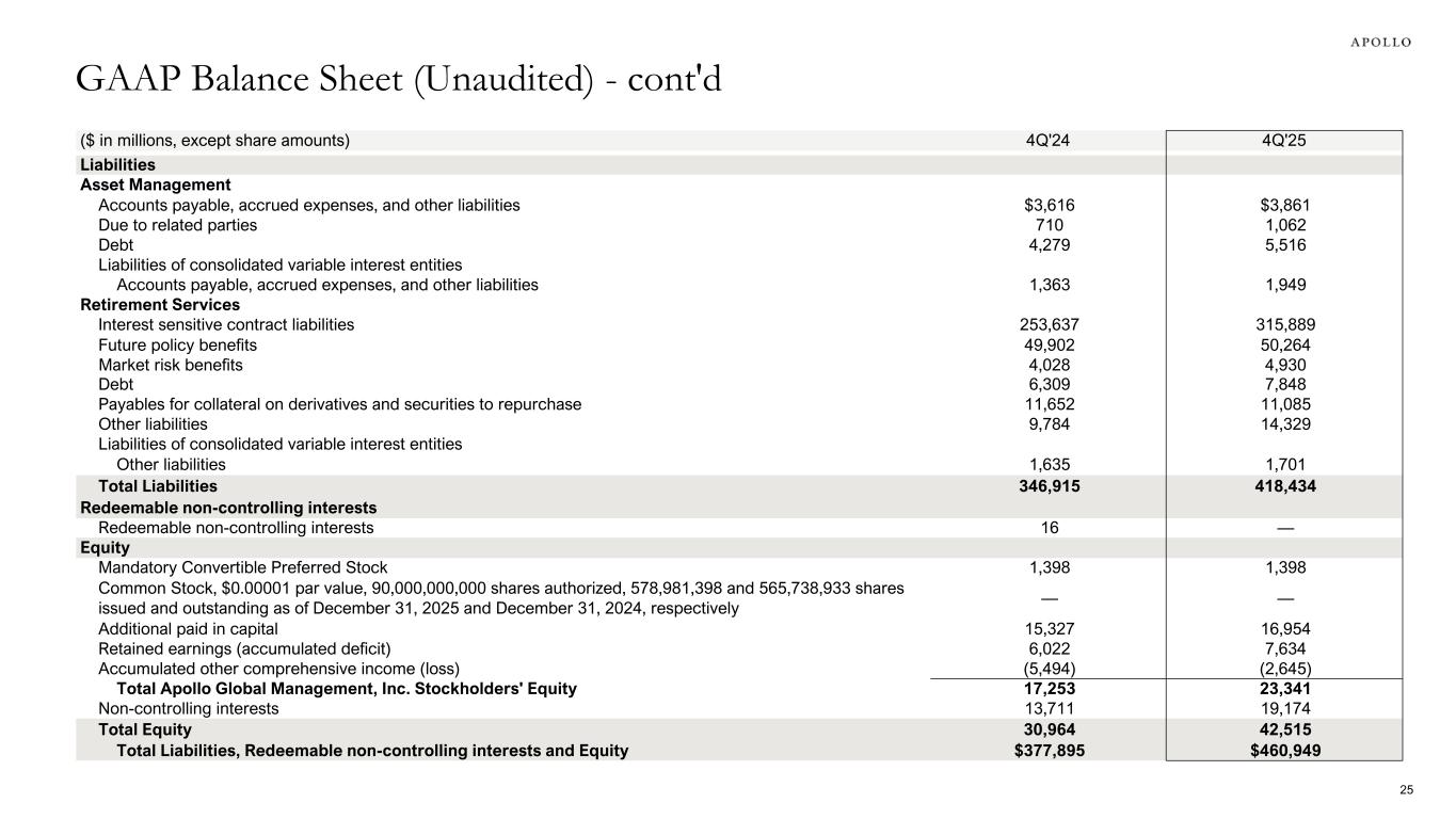 ($ in millions, except share amounts) 4Q'24 4Q'25 Liabilities Asset Management Accounts payable, accrued expenses, and other liabilities $3,616 $3,861 Due to related parties 710 1,062 Debt 4,279 5,516 Liabilities of consolidated variable interest entities Accounts payable, accrued expenses, and other liabilities 1,363 1,949 Retirement Services Interest sensitive contract liabilities 253,637 315,889 Future policy benefits 49,902 50,264 Market risk benefits 4,028 4,930 Debt 6,309 7,848 Payables for collateral on derivatives and securities to repurchase 11,652 11,085 Other liabilities 9,784 14,329 Liabilities of consolidated variable interest entities Other liabilities 1,635 1,701 Total Liabilities 346,915 418,434 Redeemable non-controlling interests Redeemable non-controlling interests 16 — Equity Mandatory Convertible Preferred Stock 1,398 1,398 Common Stock, $0.00001 par value, 90,000,000,000 shares authorized, 578,981,398 and 565,738,933 shares issued and outstanding as of December 31, 2025 and December 31, 2024, respectively — — Additional paid in capital 15,327 16,954 Retained earnings (accumulated deficit) 6,022 7,634 Accumulated other comprehensive income (loss) (5,494) (2,645) Total Apollo Global Management, Inc. Stockholders' Equity 17,253 23,341 Non-controlling interests 13,711 19,174 Total Equity 30,964 42,515 Total Liabilities, Redeemable non-controlling interests and Equity $377,895 $460,949 GAAP Balance Sheet (Unaudited) - cont'd 25