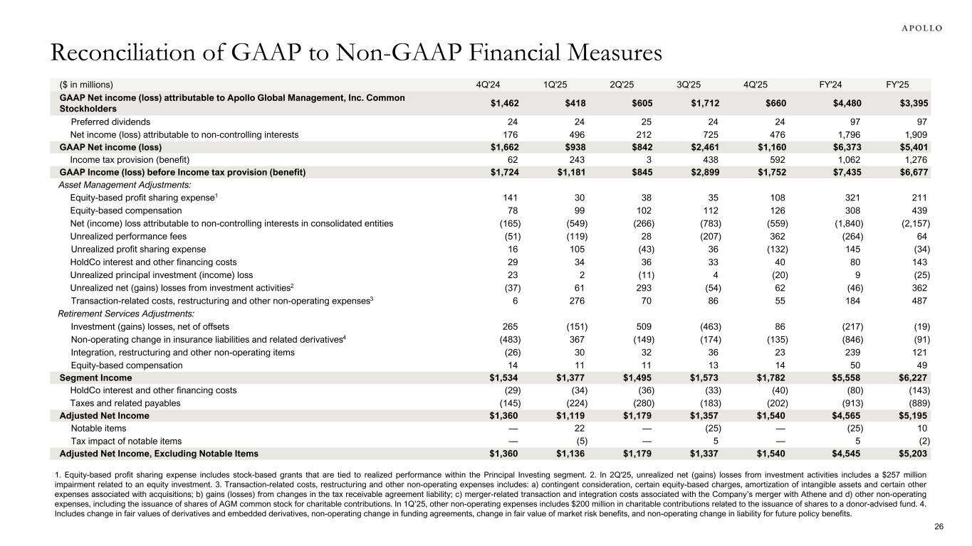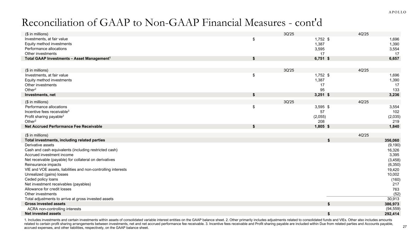 ($ in millions) 4Q'24 1Q'25 2Q'25 3Q'25 4Q'25 FY'24 FY'25 GAAP Net income (loss) attributable to Apollo Global Management, Inc. Common Stockholders $1,462 $418 $605 $1,712 $660 $4,480 $3,395 Preferred dividends 24 24 25 24 24 97 97 Net income (loss) attributable to non-controlling interests 176 496 212 725 476 1,796 1,909 GAAP Net income (loss) $1,662 $938 $842 $2,461 $1,160 $6,373 $5,401 Income tax provision (benefit) 62 243 3 438 592 1,062 1,276 GAAP Income (loss) before Income tax provision (benefit) $1,724 $1,181 $845 $2,899 $1,752 $7,435 $6,677 Asset Management Adjustments: Equity-based profit sharing expense1 141 30 38 35 108 321 211 Equity-based compensation 78 99 102 112 126 308 439 Net (income) loss attributable to non-controlling interests in consolidated entities (165) (549) (266) (783) (559) (1,840) (2,157) Unrealized performance fees (51) (119) 28 (207) 362 (264) 64 Unrealized profit sharing expense 16 105 (43) 36 (132) 145 (34) HoldCo interest and other financing costs 29 34 36 33 40 80 143 Unrealized principal investment (income) loss 23 2 (11) 4 (20) 9 (25) Unrealized net (gains) losses from investment activities2 (37) 61 293 (54) 62 (46) 362 Transaction-related costs, restructuring and other non-operating expenses3 6 276 70 86 55 184 487 Retirement Services Adjustments: Investment (gains) losses, net of offsets 265 (151) 509 (463) 86 (217) (19) Non-operating change in insurance liabilities and related derivatives4 (483) 367 (149) (174) (135) (846) (91) Integration, restructuring and other non-operating items (26) 30 32 36 23 239 121 Equity-based compensation 14 11 11 13 14 50 49 Segment Income $1,534 $1,377 $1,495 $1,573 $1,782 $5,558 $6,227 HoldCo interest and other financing costs (29) (34) (36) (33) (40) (80) (143) Taxes and related payables (145) (224) (280) (183) (202) (913) (889) Adjusted Net Income $1,360 $1,119 $1,179 $1,357 $1,540 $4,565 $5,195 Notable items — 22 — (25) — (25) 10 Tax impact of notable items — (5) — 5 — 5 (2) Adjusted Net Income, Excluding Notable Items $1,360 $1,136 $1,179 $1,337 $1,540 $4,545 $5,203 1. Equity-based profit sharing expense includes stock-based grants that are tied to realized performance within the Principal Investing segment. 2. In 2Q'25, unrealized net (gains) losses from investment activities includes a $257 million impairment related to an equity investment. 3. Transaction-related costs, restructuring and other non-operating expenses includes: a) contingent consideration, certain equity-based charges, amortization of intangible assets and certain other expenses associated with acquisitions; b) gains (losses) from changes in the tax receivable agreement liability; c) merger-related transaction and integration costs associated with the Company’s merger with Athene and d) other non-operating expenses, including the issuance of shares of AGM common stock for charitable contributions. In 1Q’25, other non-operating expenses includes $200 million in charitable contributions related to the issuance of shares to a donor-advised fund. 4. Includes change in fair values of derivatives and embedded derivatives, non-operating change in funding agreements, change in fair value of market risk benefits, and non-operating change in liability for future policy benefits. Reconciliation of GAAP to Non-GAAP Financial Measures 26