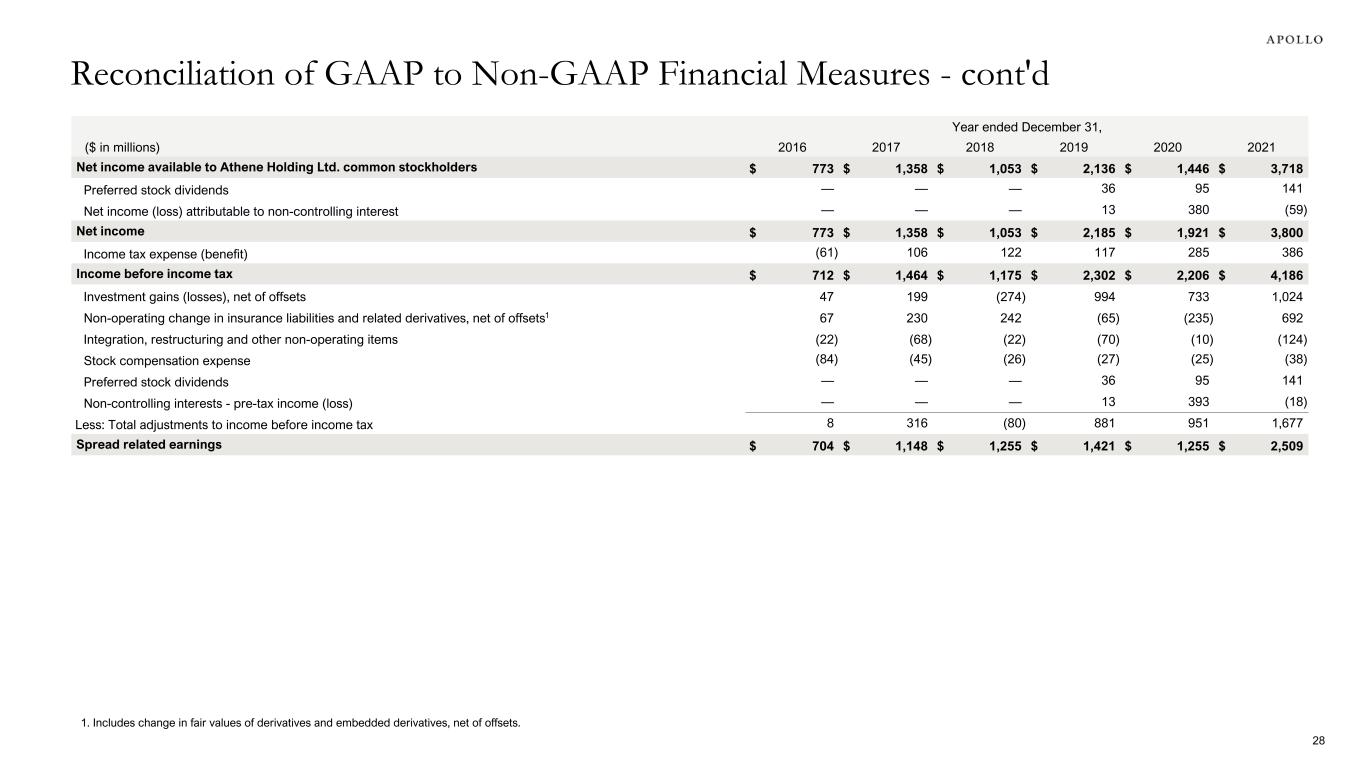 Year ended December 31, ($ in millions) 2016 2017 2018 2019 2020 2021 Net income available to Athene Holding Ltd. common stockholders $ 773 $ 1,358 $ 1,053 $ 2,136 $ 1,446 $ 3,718 Preferred stock dividends — — — 36 95 141 Net income (loss) attributable to non-controlling interest — — — 13 380 (59) Net income $ 773 $ 1,358 $ 1,053 $ 2,185 $ 1,921 $ 3,800 Income tax expense (benefit) (61) 106 122 117 285 386 Income before income tax $ 712 $ 1,464 $ 1,175 $ 2,302 $ 2,206 $ 4,186 Investment gains (losses), net of offsets 47 199 (274) 994 733 1,024 Non-operating change in insurance liabilities and related derivatives, net of offsets1 67 230 242 (65) (235) 692 Integration, restructuring and other non-operating items (22) (68) (22) (70) (10) (124) Stock compensation expense (84) (45) (26) (27) (25) (38) Preferred stock dividends — — — 36 95 141 Non-controlling interests - pre-tax income (loss) — — — 13 393 (18) Less: Total adjustments to income before income tax 8 316 (80) 881 951 1,677 Spread related earnings $ 704 $ 1,148 $ 1,255 $ 1,421 $ 1,255 $ 2,509 Reconciliation of GAAP to Non-GAAP Financial Measures - cont'd 28 1. Includes change in fair values of derivatives and embedded derivatives, net of offsets.