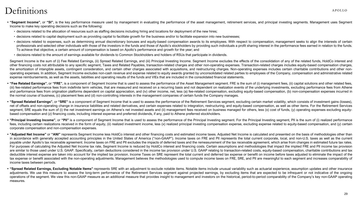 • “Segment Income”, or “SI”, is the key performance measure used by management in evaluating the performance of the asset management, retirement services, and principal investing segments. Management uses Segment Income to make key operating decisions such as the following: ▪ decisions related to the allocation of resources such as staffing decisions including hiring and locations for deployment of the new hires; ▪ decisions related to capital deployment such as providing capital to facilitate growth for the business and/or to facilitate expansion into new businesses; ▪ decisions related to expenses, such as determining annual discretionary bonuses and equity-based compensation awards to its employees. With respect to compensation, management seeks to align the interests of certain professionals and selected other individuals with those of the investors in the funds and those of Apollo’s stockholders by providing such individuals a profit sharing interest in the performance fees earned in relation to the funds. To achieve that objective, a certain amount of compensation is based on Apollo’s performance and growth for the year; and ▪ decisions related to the amount of earnings available for dividends to Common Stockholders and holders of RSUs that participate in dividends. Segment Income is the sum of (i) Fee Related Earnings, (ii) Spread Related Earnings, and (iii) Principal Investing Income. Segment Income excludes the effects of the consolidation of any of the related funds, HoldCo interest and other financing costs not attributable to any specific segment, Taxes and Related Payables, transaction-related charges and other non-operating expenses. Transaction-related charges includes equity-based compensation charges, the amortization of intangible assets, contingent consideration, and certain other charges associated with acquisitions, and restructuring charges. Non-operating expenses includes certain charitable contributions and other non- operating expenses. In addition, Segment Income excludes non-cash revenue and expense related to equity awards granted by unconsolidated related parties to employees of the Company, compensation and administrative related expense reimbursements, as well as the assets, liabilities and operating results of the funds and VIEs that are included in the consolidated financial statements. • “Fee Related Earnings”, or “FRE”, is a component of Segment Income that is used to assess the performance of the Asset Management segment. FRE is the sum of (i) management fees, (ii) capital solutions and other related fees, (iii) fee-related performance fees from indefinite term vehicles, that are measured and received on a recurring basis and not dependent on realization events of the underlying investments, excluding performance fees from Athene and performance fees from origination platforms dependent on capital appreciation, and (iv) other income, net, less (a) fee-related compensation, excluding equity-based compensation, (b) non-compensation expenses incurred in the normal course of business, (c) placement fees and (d) non-controlling interests in the management companies of certain funds the Company manages. • “Spread Related Earnings”, or “SRE” is a component of Segment Income that is used to assess the performance of the Retirement Services segment, excluding certain market volatility, which consists of investment gains (losses), net of offsets and non-operating change in insurance liabilities and related derivatives, and certain expenses related to integration, restructuring, and equity-based compensation, as well as other items. For the Retirement Services segment, SRE equals the sum of (i) the net investment earnings on Athene’s net invested assets and (ii) management fees received on business managed for others, less (x) cost of funds, (y) operating expenses excluding equity- based compensation and (z) financing costs, including interest expense and preferred dividends, if any, paid to Athene preferred stockholders. • “Principal Investing Income”, or “PII” is a component of Segment Income that is used to assess the performance of the Principal Investing segment. For the Principal Investing segment, PII is the sum of (i) realized performance fees, including certain realizations received in the form of equity, (ii) realized investment income, less (x) realized principal investing compensation expense, excluding expense related to equity-based compensation, and (y) certain corporate compensation and non-compensation expenses. • “Adjusted Net Income” or “ANI” represents Segment Income less HoldCo interest and other financing costs and estimated income taxes. Adjusted Net Income is calculated and presented on the basis of methodologies other than in accordance with generally accepted accounting principles in the United States of America (“non-GAAP”). Income taxes on FRE and PII represents the total current corporate, local, and non-U.S. taxes as well as the current payable under Apollo’s tax receivable agreement. Income taxes on FRE and PII excludes the impacts of deferred taxes and the remeasurement of the tax receivable agreement, which arise from changes in estimated future tax rates. For purposes of calculating the Adjusted Net Income tax rate, Segment Income is reduced by HoldCo interest and financing costs. Certain assumptions and methodologies that impact the implied FRE and PII income tax provision are similar to those used under U.S. GAAP. Specifically, certain deductions considered in the income tax provision under U.S. GAAP relating to transaction-related costs, equity-based compensation, charitable contributions and tax deductible interest expense are taken into account for the implied tax provision. Income Taxes on SRE represent the total current and deferred tax expense or benefit on income before taxes adjusted to eliminate the impact of the tax expense or benefit associated wit