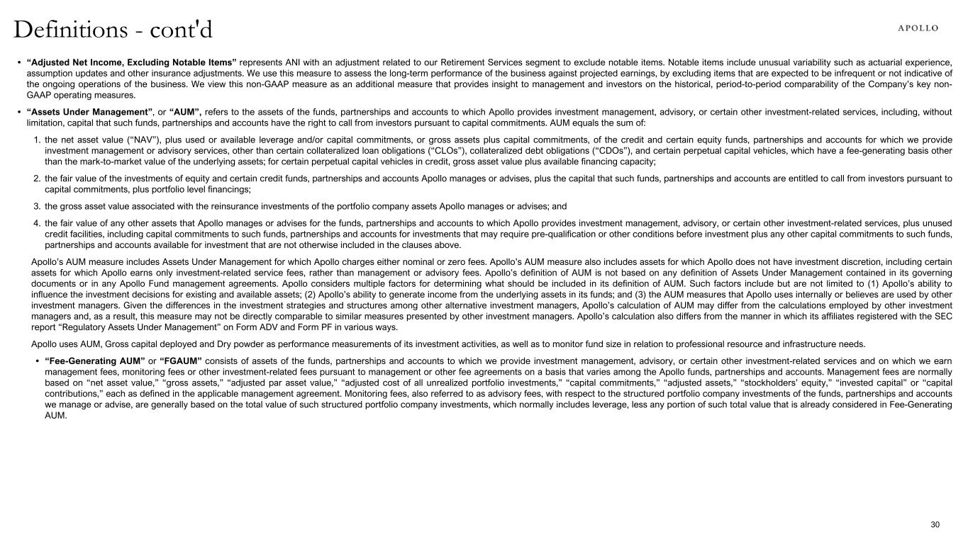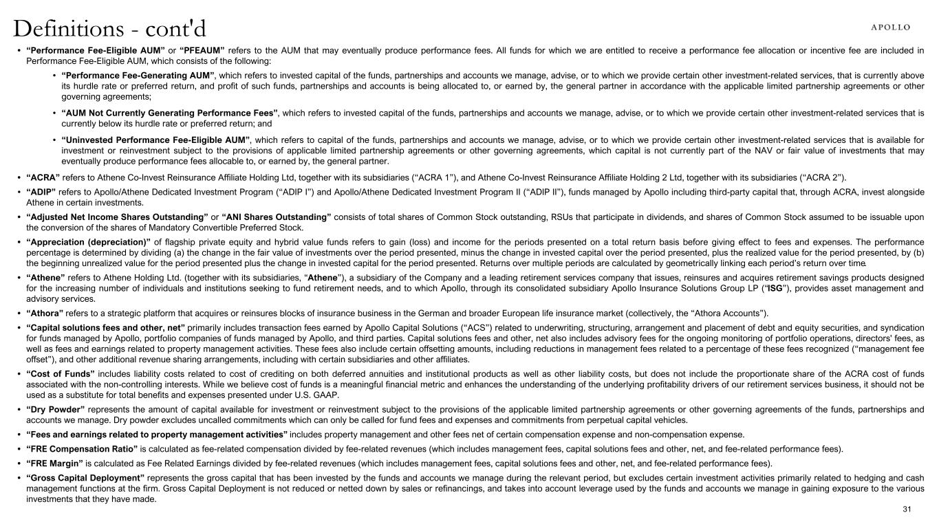 • “Adjusted Net Income, Excluding Notable Items” represents ANI with an adjustment related to our Retirement Services segment to exclude notable items. Notable items include unusual variability such as actuarial experience, assumption updates and other insurance adjustments. We use this measure to assess the long-term performance of the business against projected earnings, by excluding items that are expected to be infrequent or not indicative of the ongoing operations of the business. We view this non-GAAP measure as an additional measure that provides insight to management and investors on the historical, period-to-period comparability of the Company’s key non- GAAP operating measures. • “Assets Under Management”, or “AUM”, refers to the assets of the funds, partnerships and accounts to which Apollo provides investment management, advisory, or certain other investment-related services, including, without limitation, capital that such funds, partnerships and accounts have the right to call from investors pursuant to capital commitments. AUM equals the sum of: 1. the net asset value (“NAV”), plus used or available leverage and/or capital commitments, or gross assets plus capital commitments, of the credit and certain equity funds, partnerships and accounts for which we provide investment management or advisory services, other than certain collateralized loan obligations (“CLOs”), collateralized debt obligations (“CDOs”), and certain perpetual capital vehicles, which have a fee-generating basis other than the mark-to-market value of the underlying assets; for certain perpetual capital vehicles in credit, gross asset value plus available financing capacity; 2. the fair value of the investments of equity and certain credit funds, partnerships and accounts Apollo manages or advises, plus the capital that such funds, partnerships and accounts are entitled to call from investors pursuant to capital commitments, plus portfolio level financings; 3. the gross asset value associated with the reinsurance investments of the portfolio company assets Apollo manages or advises; and 4. the fair value of any other assets that Apollo manages or advises for the funds, partnerships and accounts to which Apollo provides investment management, advisory, or certain other investment-related services, plus unused credit facilities, including capital commitments to such funds, partnerships and accounts for investments that may require pre-qualification or other conditions before investment plus any other capital commitments to such funds, partnerships and accounts available for investment that are not otherwise included in the clauses above. Apollo’s AUM measure includes Assets Under Management for which Apollo charges either nominal or zero fees. Apollo’s AUM measure also includes assets for which Apollo does not have investment discretion, including certain assets for which Apollo earns only investment-related service fees, rather than management or advisory fees. Apollo’s definition of AUM is not based on any definition of Assets Under Management contained in its governing documents or in any Apollo Fund management agreements. Apollo considers multiple factors for determining what should be included in its definition of AUM. Such factors include but are not limited to (1) Apollo’s ability to influence the investment decisions for existing and available assets; (2) Apollo’s ability to generate income from the underlying assets in its funds; and (3) the AUM measures that Apollo uses internally or believes are used by other investment managers. Given the differences in the investment strategies and structures among other alternative investment managers, Apollo’s calculation of AUM may differ from the calculations employed by other investment managers and, as a result, this measure may not be directly comparable to similar measures presented by other investment managers. Apollo’s calculation also differs from the manner in which its affiliates registered with the SEC report “Regulatory Assets Under Management” on Form ADV and Form PF in various ways. Apollo uses AUM, Gross capital deployed and Dry powder as performance measurements of its investment activities, as well as to monitor fund size in relation to professional resource and infrastructure needs. • “Fee-Generating AUM” or “FGAUM” consists of assets of the funds, partnerships and accounts to which we provide investment management, advisory, or certain other investment-related services and on which we earn management fees, monitoring fees or other investment-related fees pursuant to management or other fee agreements on a basis that varies among the Apollo funds, partnerships and accounts. Management fees are normally based on “net asset value,” “gross assets,” “adjusted par asset value,” “adjusted cost of all unrealized portfolio investments,” “capital commitments,” “adjusted assets,” “stockholders’ equity,” “invested capital” or “capital contributions,” each as defined in the applicable management agreement. Monitoring fees, also referred to as advisory fees, with respect to the structured portfolio company investments of the funds, partnerships and accounts we manage or advise, are generally based on the total value of such structured portfolio company investments, which normally includes leverage, less any portion of such total value that is already considered in Fee-Generating AUM. Definitions - cont'd 30