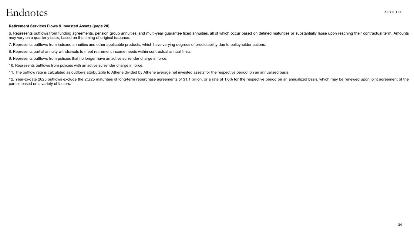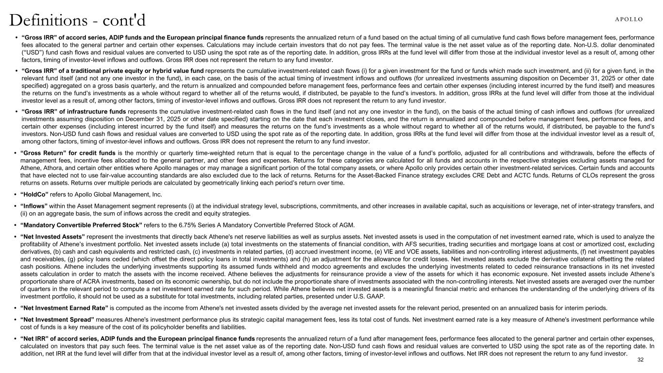• “Gross IRR” of accord series, ADIP funds and the European principal finance funds represents the annualized return of a fund based on the actual timing of all cumulative fund cash flows before management fees, performance fees allocated to the general partner and certain other expenses. Calculations may include certain investors that do not pay fees. The terminal value is the net asset value as of the reporting date. Non-U.S. dollar denominated (“USD”) fund cash flows and residual values are converted to USD using the spot rate as of the reporting date. In addition, gross IRRs at the fund level will differ from those at the individual investor level as a result of, among other factors, timing of investor-level inflows and outflows. Gross IRR does not represent the return to any fund investor. • “Gross IRR” of a traditional private equity or hybrid value fund represents the cumulative investment-related cash flows (i) for a given investment for the fund or funds which made such investment, and (ii) for a given fund, in the relevant fund itself (and not any one investor in the fund), in each case, on the basis of the actual timing of investment inflows and outflows (for unrealized investments assuming disposition on December 31, 2025 or other date specified) aggregated on a gross basis quarterly, and the return is annualized and compounded before management fees, performance fees and certain other expenses (including interest incurred by the fund itself) and measures the returns on the fund’s investments as a whole without regard to whether all of the returns would, if distributed, be payable to the fund’s investors. In addition, gross IRRs at the fund level will differ from those at the individual investor level as a result of, among other factors, timing of investor-level inflows and outflows. Gross IRR does not represent the return to any fund investor. • “Gross IRR” of infrastructure funds represents the cumulative investment-related cash flows in the fund itself (and not any one investor in the fund), on the basis of the actual timing of cash inflows and outflows (for unrealized investments assuming disposition on December 31, 2025 or other date specified) starting on the date that each investment closes, and the return is annualized and compounded before management fees, performance fees, and certain other expenses (including interest incurred by the fund itself) and measures the returns on the fund’s investments as a whole without regard to whether all of the returns would, if distributed, be payable to the fund’s investors. Non-USD fund cash flows and residual values are converted to USD using the spot rate as of the reporting date. In addition, gross IRRs at the fund level will differ from those at the individual investor level as a result of, among other factors, timing of investor-level inflows and outflows. Gross IRR does not represent the return to any fund investor. • “Gross Return” for credit funds is the monthly or quarterly time-weighted return that is equal to the percentage change in the value of a fund’s portfolio, adjusted for all contributions and withdrawals, before the effects of management fees, incentive fees allocated to the general partner, and other fees and expenses. Returns for these categories are calculated for all funds and accounts in the respective strategies excluding assets managed for Athene, Athora, and certain other entities where Apollo manages or may manage a significant portion of the total company assets, or where Apollo only provides certain other investment-related services. Certain funds and accounts that have elected not to use fair-value accounting standards are also excluded due to the lack of returns. Returns for the Asset-Backed Finance strategy excludes CRE Debt and ACTC funds. Returns of CLOs represent the gross returns on assets. Returns over multiple periods are calculated by geometrically linking each period’s return over time. • “HoldCo” refers to Apollo Global Management, Inc. • “Inflows” within the Asset Management segment represents (i) at the individual strategy level, subscriptions, commitments, and other increases in available capital, such as acquisitions or leverage, net of inter-strategy transfers, and (ii) on an aggregate basis, the sum of inflows across the credit and equity strategies. • “Mandatory Convertible Preferred Stock” refers to the 6.75% Series A Mandatory Convertible Preferred Stock of AGM. • “Net Invested Assets” represent the investments that directly back Athene's net reserve liabilities as well as surplus assets. Net invested assets is used in the computation of net investment earned rate, which is used to analyze the profitability of Athene’s investment portfolio. Net invested assets include (a) total investments on the statements of financial condition, with AFS securities, trading securities and mortgage loans at cost or amortized cost, excluding derivatives, (b) cash and cash equivalents and restricted cash, (c) investments in related parties, (d) accrued investment income, (e) VIE and VOE assets, liabilities and non-controlling interest adjustments, (f) net investment payables and receivables, (g) policy loans ceded (which offset the direct policy loans in total investments) and (h) an adjustment for the allowance for credit losses. Net invested assets exclude the derivative collateral offsetting the related cash positions. Athene includes the underlying investments supporting its assumed funds withheld and modco agreements and excludes the underlying investments related to ceded reinsurance transactions in its net invested assets calculation in order to match the assets with the income received. Athene believes the adjustments for reinsurance provide a view of the assets for which it has economic exposure. Net invested assets include Athene’s proportionate share of ACRA investments, based on its economic ownership, but do not inclu