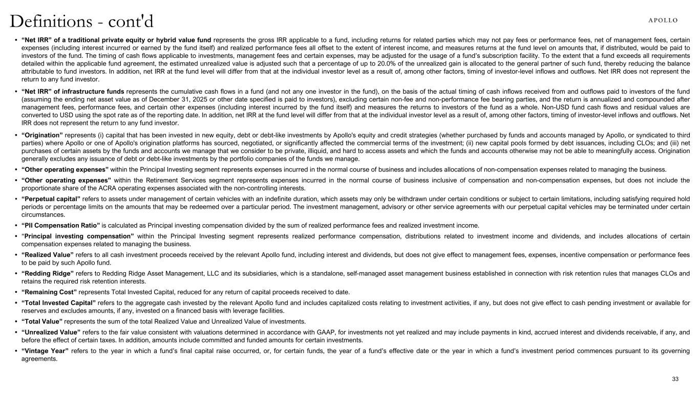• “Net IRR” of a traditional private equity or hybrid value fund represents the gross IRR applicable to a fund, including returns for related parties which may not pay fees or performance fees, net of management fees, certain expenses (including interest incurred or earned by the fund itself) and realized performance fees all offset to the extent of interest income, and measures returns at the fund level on amounts that, if distributed, would be paid to investors of the fund. The timing of cash flows applicable to investments, management fees and certain expenses, may be adjusted for the usage of a fund’s subscription facility. To the extent that a fund exceeds all requirements detailed within the applicable fund agreement, the estimated unrealized value is adjusted such that a percentage of up to 20.0% of the unrealized gain is allocated to the general partner of such fund, thereby reducing the balance attributable to fund investors. In addition, net IRR at the fund level will differ from that at the individual investor level as a result of, among other factors, timing of investor-level inflows and outflows. Net IRR does not represent the return to any fund investor. • “Net IRR” of infrastructure funds represents the cumulative cash flows in a fund (and not any one investor in the fund), on the basis of the actual timing of cash inflows received from and outflows paid to investors of the fund (assuming the ending net asset value as of December 31, 2025 or other date specified is paid to investors), excluding certain non-fee and non-performance fee bearing parties, and the return is annualized and compounded after management fees, performance fees, and certain other expenses (including interest incurred by the fund itself) and measures the returns to investors of the fund as a whole. Non-USD fund cash flows and residual values are converted to USD using the spot rate as of the reporting date. In addition, net IRR at the fund level will differ from that at the individual investor level as a result of, among other factors, timing of investor-level inflows and outflows. Net IRR does not represent the return to any fund investor. • “Origination” represents (i) capital that has been invested in new equity, debt or debt-like investments by Apollo's equity and credit strategies (whether purchased by funds and accounts managed by Apollo, or syndicated to third parties) where Apollo or one of Apollo's origination platforms has sourced, negotiated, or significantly affected the commercial terms of the investment; (ii) new capital pools formed by debt issuances, including CLOs; and (iii) net purchases of certain assets by the funds and accounts we manage that we consider to be private, illiquid, and hard to access assets and which the funds and accounts otherwise may not be able to meaningfully access. Origination generally excludes any issuance of debt or debt-like investments by the portfolio companies of the funds we manage. • “Other operating expenses” within the Principal Investing segment represents expenses incurred in the normal course of business and includes allocations of non-compensation expenses related to managing the business. • “Other operating expenses” within the Retirement Services segment represents expenses incurred in the normal course of business inclusive of compensation and non-compensation expenses, but does not include the proportionate share of the ACRA operating expenses associated with the non-controlling interests. • “Perpetual capital” refers to assets under management of certain vehicles with an indefinite duration, which assets may only be withdrawn under certain conditions or subject to certain limitations, including satisfying required hold periods or percentage limits on the amounts that may be redeemed over a particular period. The investment management, advisory or other service agreements with our perpetual capital vehicles may be terminated under certain circumstances. • “PII Compensation Ratio” is calculated as Principal investing compensation divided by the sum of realized performance fees and realized investment income. • “Principal investing compensation” within the Principal Investing segment represents realized performance compensation, distributions related to investment income and dividends, and includes allocations of certain compensation expenses related to managing the business. • “Realized Value” refers to all cash investment proceeds received by the relevant Apollo fund, including interest and dividends, but does not give effect to management fees, expenses, incentive compensation or performance fees to be paid by such Apollo fund. • “Redding Ridge” refers to Redding Ridge Asset Management, LLC and its subsidiaries, which is a standalone, self-managed asset management business established in connection with risk retention rules that manages CLOs and retains the required risk retention interests. • “Remaining Cost” represents Total Invested Capital, reduced for any return of capital proceeds received to date. • “Total Invested Capital” refers to the aggregate cash invested by the relevant Apollo fund and includes capitalized costs relating to investment activities, if any, but does not give effect to cash pending investment or available for reserves and excludes amounts, if any, invested on a financed basis with leverage facilities. • “Total Value” represents the sum of the total Realized Value and Unrealized Value of investments. • “Unrealized Value” refers to the fair value consistent with valuations determined in accordance with GAAP, for investments not yet realized and may include payments in kind, accrued interest and dividends receivable, if any, and before the effect of certain taxes. In addition, amounts include committed and funded amounts for certain investments. • “Vintage Year” refers to the year in which a fund’s final capital raise occurre