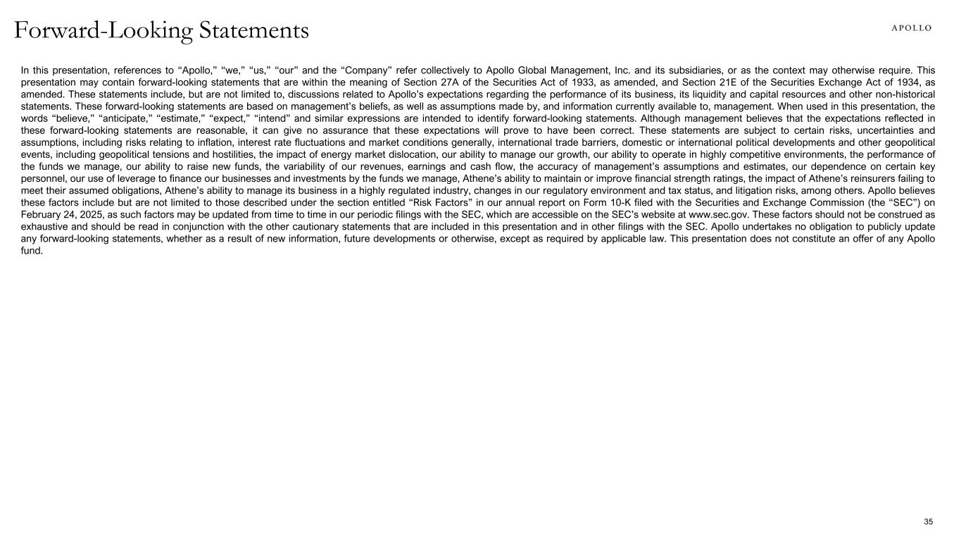 In this presentation, references to “Apollo,” “we,” “us,” “our” and the “Company” refer collectively to Apollo Global Management, Inc. and its subsidiaries, or as the context may otherwise require. This presentation may contain forward-looking statements that are within the meaning of Section 27A of the Securities Act of 1933, as amended, and Section 21E of the Securities Exchange Act of 1934, as amended. These statements include, but are not limited to, discussions related to Apollo’s expectations regarding the performance of its business, its liquidity and capital resources and other non-historical statements. These forward-looking statements are based on management’s beliefs, as well as assumptions made by, and information currently available to, management. When used in this presentation, the words “believe,” “anticipate,” “estimate,” “expect,” “intend” and similar expressions are intended to identify forward-looking statements. Although management believes that the expectations reflected in these forward-looking statements are reasonable, it can give no assurance that these expectations will prove to have been correct. These statements are subject to certain risks, uncertainties and assumptions, including risks relating to inflation, interest rate fluctuations and market conditions generally, international trade barriers, domestic or international political developments and other geopolitical events, including geopolitical tensions and hostilities, the impact of energy market dislocation, our ability to manage our growth, our ability to operate in highly competitive environments, the performance of the funds we manage, our ability to raise new funds, the variability of our revenues, earnings and cash flow, the accuracy of management’s assumptions and estimates, our dependence on certain key personnel, our use of leverage to finance our businesses and investments by the funds we manage, Athene’s ability to maintain or improve financial strength ratings, the impact of Athene’s reinsurers failing to meet their assumed obligations, Athene’s ability to manage its business in a highly regulated industry, changes in our regulatory environment and tax status, and litigation risks, among others. Apollo believes these factors include but are not limited to those described under the section entitled “Risk Factors” in our annual report on Form 10-K filed with the Securities and Exchange Commission (the “SEC”) on February 24, 2025, as such factors may be updated from time to time in our periodic filings with the SEC, which are accessible on the SEC’s website at www.sec.gov. These factors should not be construed as exhaustive and should be read in conjunction with the other cautionary statements that are included in this presentation and in other filings with the SEC. Apollo undertakes no obligation to publicly update any forward-looking statements, whether as a result of new information, future developments or otherwise, except as required by applicable law. This presentation does not constitute an offer of any Apollo fund. 35 Forward-Looking Statements
