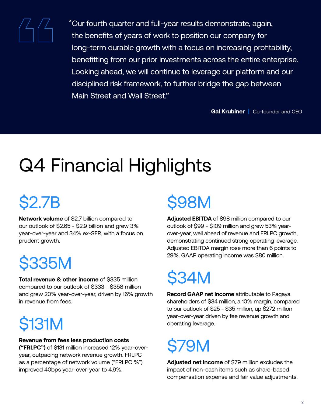 PAGAYA TECHNOLOGIES LTD. RECONCILIATION OF NON-GAAP FINANCIAL MEASURES (UNAUDITED) ($ in thousands, unless otherwise noted) Three Months Ended December 31, Year Ended December 31, 2025 2024 2025 2024 Net Income (Loss) Attributable to Pagaya Technologies Ltd. $ 34,296 $ (237,922) $ 81,389 $ (401,406) Adjusted to exclude the following: Share-based compensation 9,136 15,645 54,118 61,497 Fair value adjustment to contingent liability (100) — (5,907) — Fair value adjustment to warrant liability (2,656) (1,991) 3,830 (2,349) Impairment loss on certain investments, net 37,117 234,995 98,321 394,484 Write-off of capitalized software and other assets 179 100 4,920 3,245 Restructuring expenses — — 1,392 3,583 Transaction-related expenses — 488 23 2,095 Non-recurring expenses 779 1,910 37,232 5,717 Adjusted Net Income 78,751 13,225 275,318 66,866 Adjusted to exclude the following: Interest expenses 19,179 26,085 85,337 90,183 Income tax (benefit) expense (6,973) 16,585 (19,745) 24,576 Depreciation and amortization 7,126 8,278 30,077 28,753 Adjusted EBITDA $ 98,083 $ 64,173 $ 370,987 $ 210,378 Three Months Ended December 31, Year Ended December 31, 2025 2024 2025 2024 Operating Income $ 79,715 $ 31,739 $263,827 $ 66,840 Add: Technology, data and product development 19,078 18,601 75,213 76,571 Add: Sales and marketing 9,884 15,376 53,591 50,404 Add: General and administrative 36,084 55,474 159,560 240,781 Less: Interest income 15,101 7,619 48,434 32,291 Less: Investment loss, net (1,329) (3,894) (8,415) (4,593) Fee Revenue Less Production Costs (FRLPC) $130,989 $117,465 $512,172 $406,898 Network Volume (in millions) 2,684 2,604 10,534 9,705 Fee Revenue Less Production Costs % (FRLPC %) 4.9 % 4.5 % 4.9 % 4.2 %