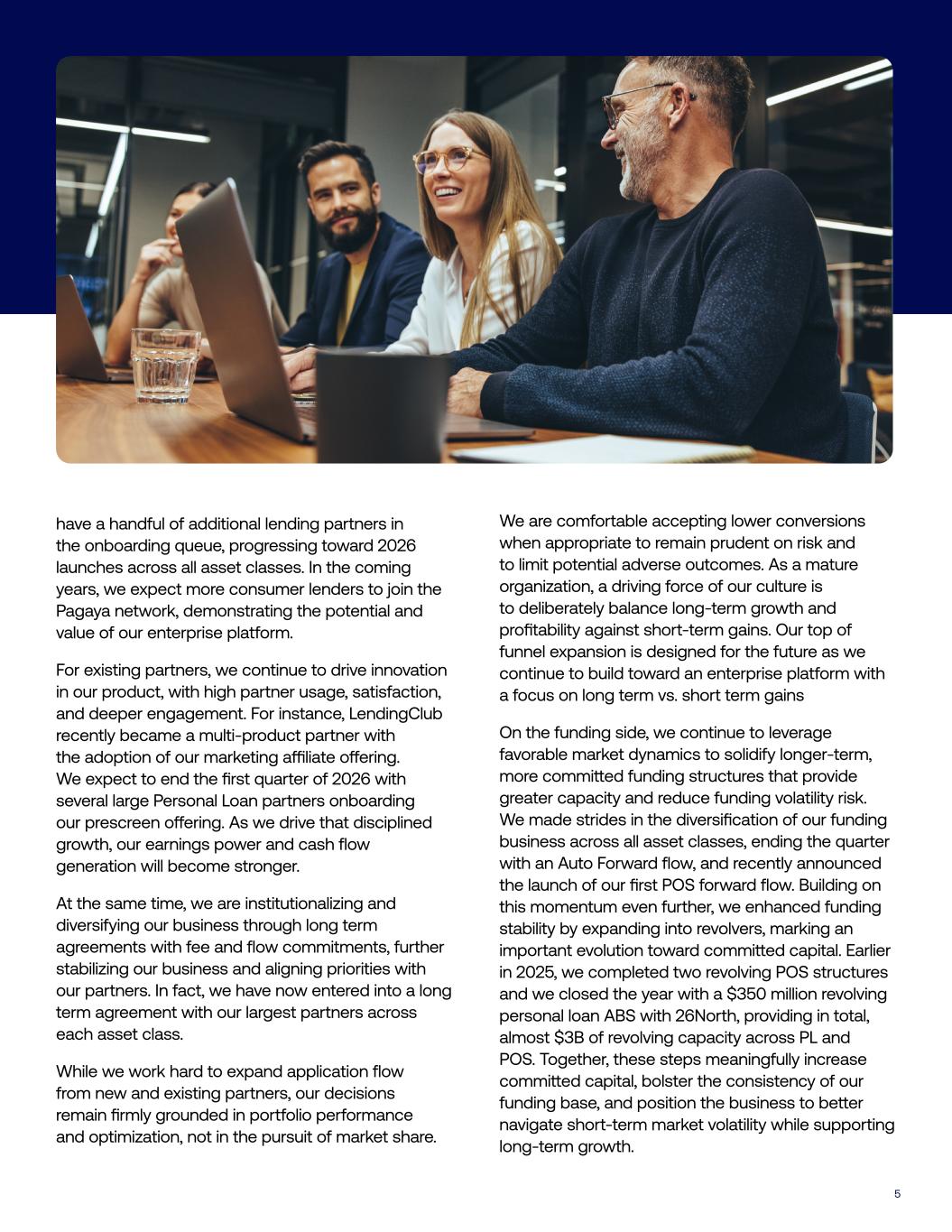 5 have a handful of additional lending partners in the onboarding queue, progressing toward 2026 launches across all asset classes. In the coming years, we expect more consumer lenders to join the Pagaya network, demonstrating the potential and value of our enterprise platform. For existing partners, we continue to drive innovation in our product, with high partner usage, satisfaction, and deeper engagement. For instance, LendingClub recently became a multi-product partner with the adoption of our marketing affiliate offering. We expect to end the first quarter of 2026 with several large Personal Loan partners onboarding our prescreen offering. As we drive that disciplined growth, our earnings power and cash flow generation will become stronger. At the same time, we are institutionalizing and diversifying our business through long term agreements with fee and flow commitments, further stabilizing our business and aligning priorities with our partners. In fact, we have now entered into a long term agreement with our largest partners across each asset class. While we work hard to expand application flow from new and existing partners, our decisions remain firmly grounded in portfolio performance and optimization, not in the pursuit of market share. We are comfortable accepting lower conversions when appropriate to remain prudent on risk and to limit potential adverse outcomes. As a mature organization, a driving force of our culture is to deliberately balance long-term growth and profitability against short-term gains. Our top of funnel expansion is designed for the future as we continue to build toward an enterprise platform with a focus on long term vs. short term gains On the funding side, we continue to leverage favorable market dynamics to solidify longer-term, more committed funding structures that provide greater capacity and reduce funding volatility risk. We made strides in the diversification of our funding business across all asset classes, ending the quarter with an Auto Forward flow, and recently announced the launch of our first POS forward flow. Building on this momentum even further, we enhanced funding stability by expanding into revolvers, marking an important evolution toward committed capital. Earlier in 2025, we completed two revolving POS structures and we closed the year with a $350 million revolving personal loan ABS with 26North, providing in total, almost $3B of revolving capacity across PL and POS. Together, these steps meaningfully increase committed capital, bolster the consistency of our funding base, and position the business to better navigate short-term market volatility while supporting long-term growth.