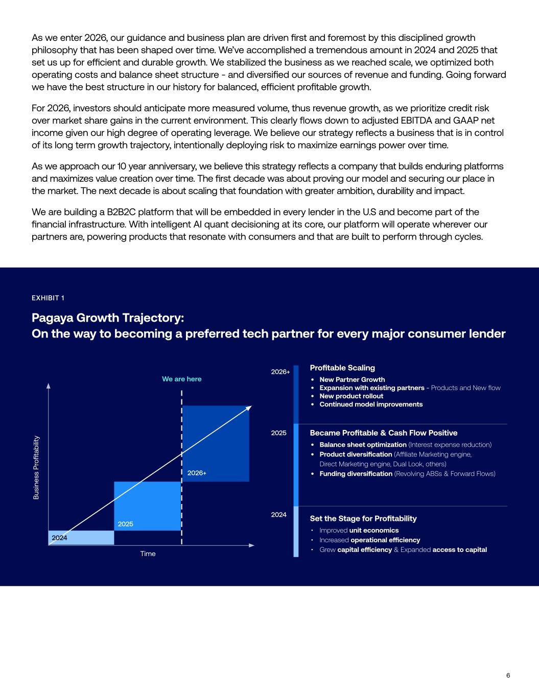 6 Pagaya Growth Trajectory: On the way to becoming a preferred tech partner for every major consumer lender B us in e ss P ro fit ab ili ty Time We are here 2026+ 2024 2025 2026+ Profitable Scaling • New Partner Growth • Expansion with existing partners - Products and New flow • New product rollout • Continued model improvements Became Profitable & Cash Flow Positive • Balance sheet optimization (Interest expense reduction) • Product diversification (Affiliate Marketing engine, Direct Marketing engine, Dual Look, others) • Funding diversification (Revolving ABSs & Forward Flows) Set the Stage for Profitability • Improved unit economics • Increased operational efficiency • Grew capital efficiency & Expanded access to capital EXHIBIT 1 As we enter 2026, our guidance and business plan are driven first and foremost by this disciplined growth philosophy that has been shaped over time. We’ve accomplished a tremendous amount in 2024 and 2025 that set us up for efficient and durable growth. We stabilized the business as we reached scale, we optimized both operating costs and balance sheet structure - and diversified our sources of revenue and funding. Going forward we have the best structure in our history for balanced, efficient profitable growth. For 2026, investors should anticipate more measured volume, thus revenue growth, as we prioritize credit risk over market share gains in the current environment. This clearly flows down to adjusted EBITDA and GAAP net income given our high degree of operating leverage. We believe our strategy reflects a business that is in control of its long term growth trajectory, intentionally deploying risk to maximize earnings power over time. As we approach our 10 year anniversary, we believe this strategy reflects a company that builds enduring platforms and maximizes value creation over time. The first decade was about proving our model and securing our place in the market. The next decade is about scaling that foundation with greater ambition, durability and impact. We are building a B2B2C platform that will be embedded in every lender in the U.S and become part of the financial infrastructure. With intelligent AI quant decisioning at its core, our platform will operate wherever our partners are, powering products that resonate with consumers and that are built to perform through cycles. 2024 2025