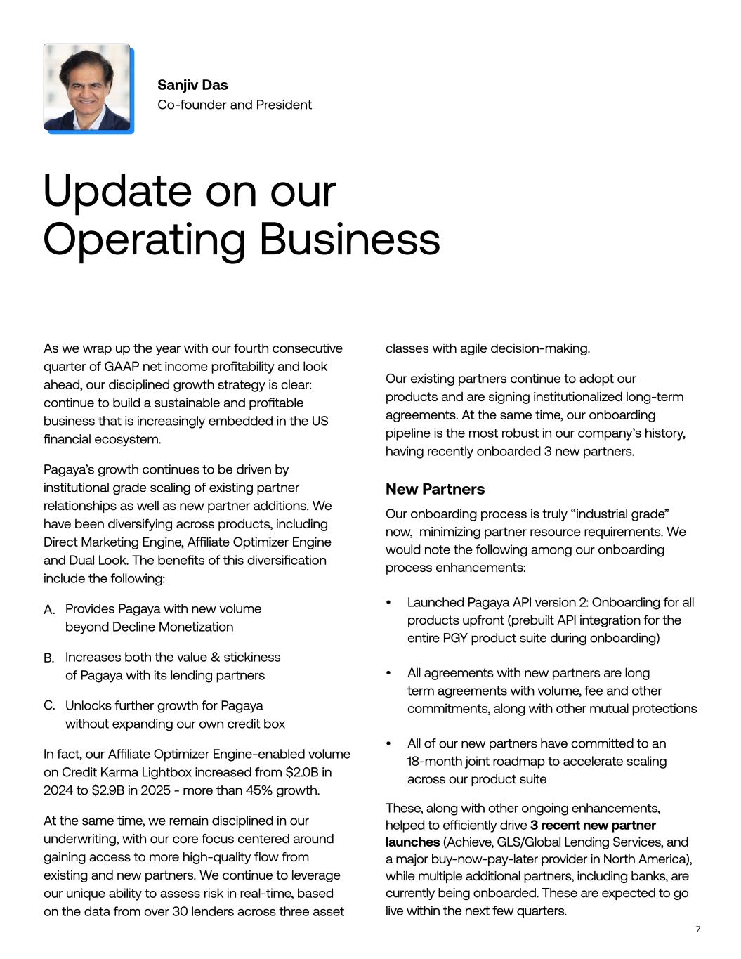 As we wrap up the year with our fourth consecutive quarter of GAAP net income profitability and look ahead, our disciplined growth strategy is clear: continue to build a sustainable and profitable business that is increasingly embedded in the US financial ecosystem. Pagaya’s growth continues to be driven by institutional grade scaling of existing partner relationships as well as new partner additions. We have been diversifying across products, including Direct Marketing Engine, Affiliate Optimizer Engine and Dual Look. The benefits of this diversification include the following: 1. Provides Pagaya with new volume beyond Decline Monetization 2. Increases both the value & stickiness of Pagaya with its lending partners 3. Unlocks further growth for Pagaya without expanding our own credit box In fact, our Affiliate Optimizer Engine-enabled volume on Credit Karma Lightbox increased from $2.0B in 2024 to $2.9B in 2025 - more than 45% growth. At the same time, we remain disciplined in our underwriting, with our core focus centered around gaining access to more high-quality flow from existing and new partners. We continue to leverage our unique ability to assess risk in real-time, based on the data from over 30 lenders across three asset Sanjiv Das Co-founder and President 7 Update on our Operating Business classes with agile decision-making. Our existing partners continue to adopt our products and are signing institutionalized long-term agreements. At the same time, our onboarding pipeline is the most robust in our company’s history, having recently onboarded 3 new partners. New Partners Our onboarding process is truly “industrial grade” now, minimizing partner resource requirements. We would note the following among our onboarding process enhancements: • Launched Pagaya API version 2: Onboarding for all products upfront (prebuilt API integration for the entire PGY product suite during onboarding) • All agreements with new partners are long term agreements with volume, fee and other commitments, along with other mutual protections • All of our new partners have committed to an 18-month joint roadmap to accelerate scaling across our product suite These, along with other ongoing enhancements, helped to efficiently drive 3 recent new partner launches (Achieve, GLS/Global Lending Services, and a major buy-now-pay-later provider in North America), while multiple additional partners, including banks, are currently being onboarded. These are expected to go live within the next few quarters. A. B. C.