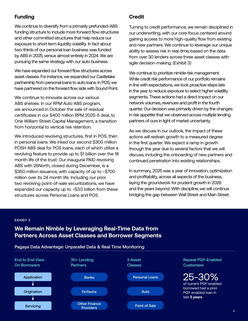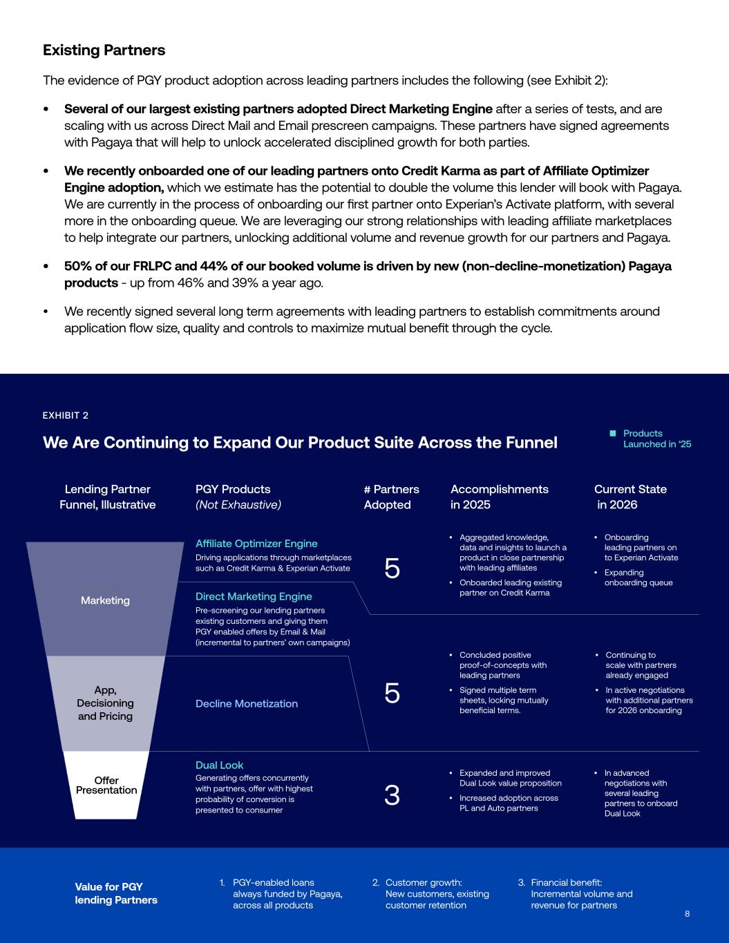 Existing Partners The evidence of PGY product adoption across leading partners includes the following (see Exhibit 2): • Several of our largest existing partners adopted Direct Marketing Engine after a series of tests, and are scaling with us across Direct Mail and Email prescreen campaigns. These partners have signed agreements with Pagaya that will help to unlock accelerated disciplined growth for both parties. • We recently onboarded one of our leading partners onto Credit Karma as part of Affiliate Optimizer Engine adoption, which we estimate has the potential to double the volume this lender will book with Pagaya. We are currently in the process of onboarding our first partner onto Experian’s Activate platform, with several more in the onboarding queue. We are leveraging our strong relationships with leading affiliate marketplaces to help integrate our partners, unlocking additional volume and revenue growth for our partners and Pagaya. • 50% of our FRLPC and 44% of our booked volume is driven by new (non-decline-monetization) Pagaya products - up from 46% and 39% a year ago. • We recently signed several long term agreements with leading partners to establish commitments around application flow size, quality and controls to maximize mutual benefit through the cycle. EXHIBIT 2 We Are Continuing to Expand Our Product Suite Across the Funnel Lending Partner Funnel, Illustrative PGY Products (Not Exhaustive) Current State in 2026 # Partners Adopted Accomplishments in 2025 Marketing App, Decisioning and Pricing Offer Presentation Affiliate Optimizer Engine Driving applications through marketplaces such as Credit Karma & Experian Activate Direct Marketing Engine Pre-screening our lending partners existing customers and giving them PGY enabled offers by Email & Mail (incremental to partners’ own campaigns) Decline Monetization Dual Look Generating offers concurrently with partners, offer with highest probability of conversion is presented to consumer • Aggregated knowledge, data and insights to launch a product in close partnership with leading affiliates • Onboarded leading existing partner on Credit Karma • Onboarding leading partners on to Experian Activate • Expanding onboarding queue • Concluded positive proof-of-concepts with leading partners • Signed multiple term sheets, locking mutually beneficial terms. • Continuing to scale with partners already engaged • In active negotiations with additional partners for 2026 onboarding • Expanded and improved Dual Look value proposition • Increased adoption across PL and Auto partners • In advanced negotiations with several leading partners to onboard Dual Look Products Launched in ‘25 5 5 3 8 Value for PGY lending Partners 1. PGY-enabled loans always funded by Pagaya, across all products 2. Customer growth: New customers, existing customer retention 3. Financial benefit: Incremental volume and revenue for partners