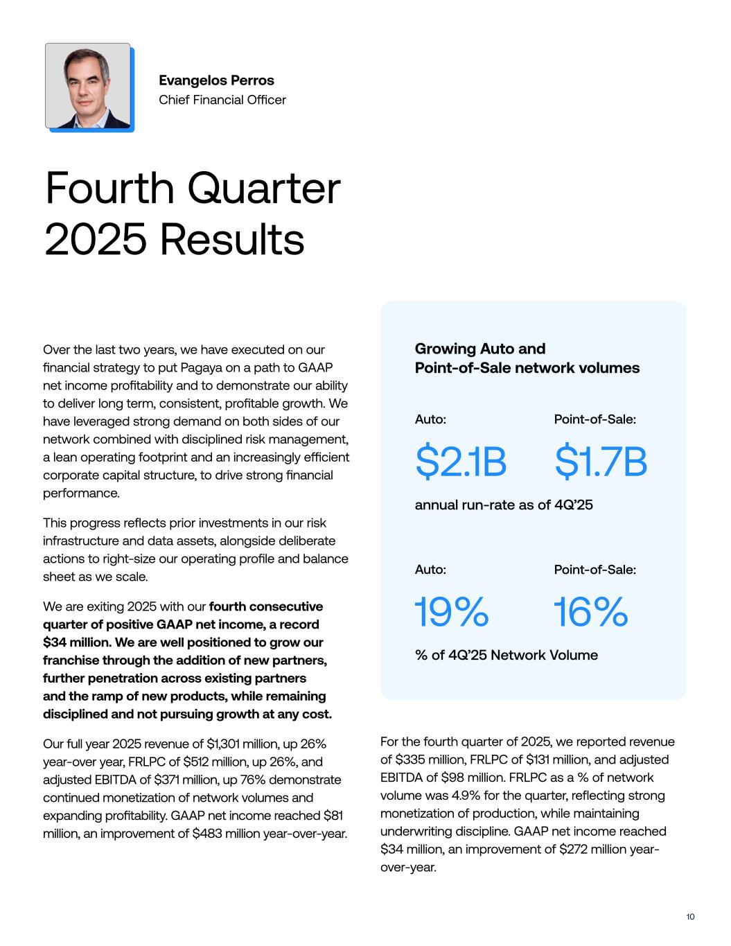 9 Funding We continue to diversify from a primarily prefunded-ABS funding structure to include more forward flow structures and other committed structures that help reduce our exposure to short term liquidity volatility. In fact about two-thirds of our personal loan business was funded by ABS in 2025, versus almost entirely in 2024. We are pursuing the same strategy with our auto business. We have expanded our forward flow structures across asset classes. For instance, we expanded our Castlelake partnership from personal loans to auto loans. In POS, we have partnered on the forward flow side with Sound Point. We continue to innovate across our various ABS shelves. In our RPM Auto ABS program, we announced in October the sale of residual certificates in our $400 million RPM 2025-5 deal, to One William Street Capital Management, a transition from horizontal to vertical risk retention. We introduced revolving structures, first in POS, then in personal loans. We inked our second $300 million POSH ABS deal for POS loans, each of which utilize a revolving feature to provide up to $1 billion over the 18 month life of the trust. Our inaugural PAID revolving ABS with 26North, closed during December, is a $350 million issuance, with capacity of up to ~$700 million over its 24 month life. Including our prior two revolving point-of-sale securitizations, we have expanded our capacity up to ~$3.0 billion from these structures across Personal Loans and POS. Credit Turning to credit performance, we remain disciplined in our underwriting, with our core focus centered around gaining access to more high-quality flow from existing and new partners. We continue to leverage our unique ability to assess risk in real-time, based on the data from over 30 lenders across three asset classes with agile decision-making. (Exhibit 3) We continue to prioritize nimble risk management. While credit risk performance of our portfolio remains in line with expectations, we took proactive steps late in the year to reduce exposure to select higher volatility segments. These actions had a direct impact on our network volumes, revenues and profit in the fourth quarter. Our decision was primarily driven by the changes in risk appetite that we observed across multiple lending partners of ours in light of market uncertainty. As we discuss in our outlook, the impact of these actions will restrain growth to a measured degree in the first quarter. We expect a ramp in growth through the year due to several factors that we will discuss, including the onboarding of new partners and continued penetration into existing relationships. In summary, 2025 was a year of innovation, optimization and profitability, across all aspects of the business, laying the groundwork for prudent growth in 2026 and the years beyond. With discipline, we will continue bridging the gap between Wall Street and Main Street. EXHIBIT 3 We Remain Nimble by Leveraging Real-Time Data from Partners Across Asset Classes and Borrower Segments Pagaya Data Advantage: Unparallel Data & Real Time Monitoring End to End View On Borrowers 30+ Lending Partners 3 Asset Classes Repeat PGY-Enabled Customers Application Origination Servicing Personal Loans Auto Point of Sale 25-30% of current PGY-enabled borrowed had a prior PGY-enabled loan in last 3 years Banks FinTechs Other Finance Providers