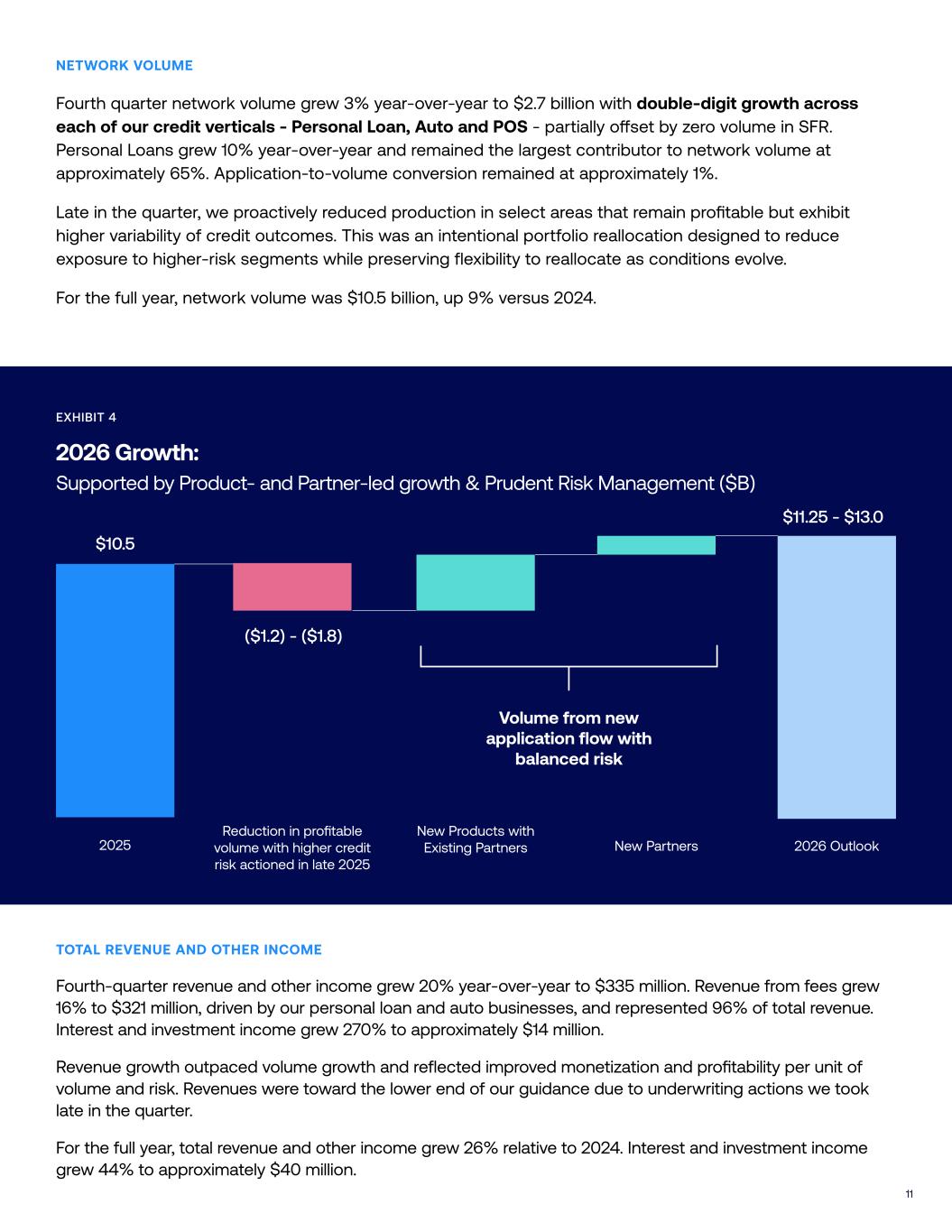 11 NETWORK VOLUME Fourth quarter network volume grew 3% year-over-year to $2.7 billion with double-digit growth across each of our credit verticals - Personal Loan, Auto and POS - partially offset by zero volume in SFR. Personal Loans grew 10% year-over-year and remained the largest contributor to network volume at approximately 65%. Application-to-volume conversion remained at approximately 1%. Late in the quarter, we proactively reduced production in select areas that remain profitable but exhibit higher variability of credit outcomes. This was an intentional portfolio reallocation designed to reduce exposure to higher-risk segments while preserving flexibility to reallocate as conditions evolve. For the full year, network volume was $10.5 billion, up 9% versus 2024. 2026 Growth: Supported by Product- and Partner-led growth & Prudent Risk Management ($B) $10.5 ($1.2) - ($1.8) $11.25 - $13.0 2025 Reduction in profitable volume with higher credit risk actioned in late 2025 New Products with Existing Partners New Partners 2026 Outlook Volume from new application flow with balanced risk TOTAL REVENUE AND OTHER INCOME Fourth-quarter revenue and other income grew 20% year-over-year to $335 million. Revenue from fees grew 16% to $321 million, driven by our personal loan and auto businesses, and represented 96% of total revenue. Interest and investment income grew 270% to approximately $14 million. Revenue growth outpaced volume growth and reflected improved monetization and profitability per unit of volume and risk. Revenues were toward the lower end of our guidance due to underwriting actions we took late in the quarter. For the full year, total revenue and other income grew 26% relative to 2024. Interest and investment income grew 44% to approximately $40 million. EXHIBIT 4