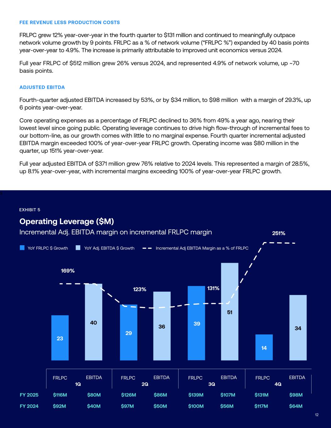 12 s FEE REVENUE LESS PRODUCTION COSTS FRLPC grew 12% year-over-year in the fourth quarter to $131 million and continued to meaningfully outpace network volume growth by 9 points. FRLPC as a % of network volume (“FRLPC %”) expanded by 40 basis points year-over-year to 4.9%. The increase is primarily attributable to improved unit economics versus 2024. Full year FRLPC of $512 million grew 26% versus 2024, and represented 4.9% of network volume, up ~70 basis points. ADJUSTED EBITDA Fourth-quarter adjusted EBITDA increased by 53%, or by $34 million, to $98 million with a margin of 29.3%, up 6 points year-over-year. Core operating expenses as a percentage of FRLPC declined to 36% from 49% a year ago, nearing their lowest level since going public. Operating leverage continues to drive high flow-through of incremental fees to our bottom-line, as our growth comes with little to no marginal expense. Fourth quarter incremental adjusted EBITDA margin exceeded 100% of year-over-year FRLPC growth. Operating income was $80 million in the quarter, up 151% year-over-year. Full year adjusted EBITDA of $371 million grew 76% relative to 2024 levels. This represented a margin of 28.5%, up 8.1% year-over-year, with incremental margins exceeding 100% of year-over-year FRLPC growth. Operating Leverage ($M) Incremental Adj. EBITDA margin on incremental FRLPC margin YoY FRLPC $ Growth Incremental Adj EBITDA Margin as a % of FRLPC FRLPC EBITDA 1Q FRLPC EBITDA 2Q FRLPC EBITDA 3Q FRLPC EBITDA 4Q EXHIBIT 5 YoY Adj. EBITDA $ Growth FY 2025 FY 2024 $116M $92M $80M $40M $126M $97M $86M $50M $139M $100M $107M $56M $131M $117M $98M $64M 169% 123% 131% 251% 23 29 39 14 40 36 51 34 12