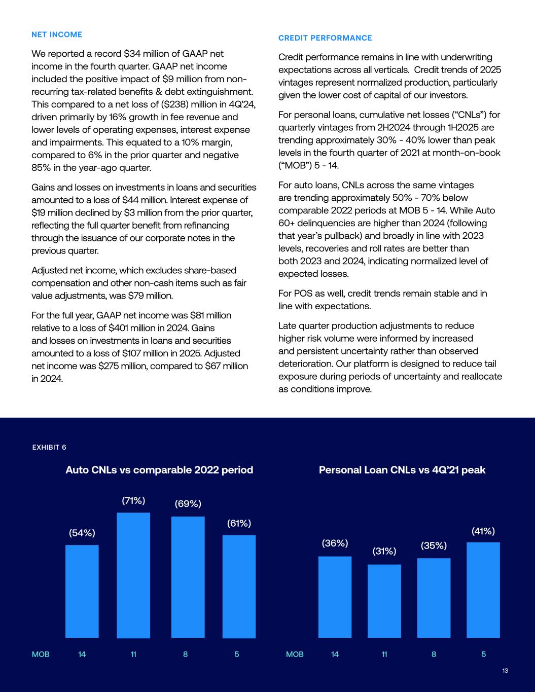 NET INCOME We reported a record $34 million of GAAP net income in the fourth quarter. GAAP net income included the positive impact of $9 million from non- recurring tax-related benefits & debt extinguishment. This compared to a net loss of ($238) million in 4Q’24, driven primarily by 16% growth in fee revenue and lower levels of operating expenses, interest expense and impairments. This equated to a 10% margin, compared to 6% in the prior quarter and negative 85% in the year-ago quarter. Gains and losses on investments in loans and securities amounted to a loss of $44 million. Interest expense of $19 million declined by $3 million from the prior quarter, reflecting the full quarter benefit from refinancing through the issuance of our corporate notes in the previous quarter. Adjusted net income, which excludes share-based compensation and other non-cash items such as fair value adjustments, was $79 million. For the full year, GAAP net income was $81 million relative to a loss of $401 million in 2024. Gains and losses on investments in loans and securities amounted to a loss of $107 million in 2025. Adjusted net income was $275 million, compared to $67 million in 2024. CREDIT PERFORMANCE Credit performance remains in line with underwriting expectations across all verticals. Credit trends of 2025 vintages represent normalized production, particularly given the lower cost of capital of our investors. For personal loans, cumulative net losses (“CNLs”) for quarterly vintages from 2H2024 through 1H2025 are trending approximately 30% - 40% lower than peak levels in the fourth quarter of 2021 at month-on-book (“MOB”) 5 - 14. For auto loans, CNLs across the same vintages are trending approximately 50% - 70% below comparable 2022 periods at MOB 5 - 14. While Auto 60+ delinquencies are higher than 2024 (following that year’s pullback) and broadly in line with 2023 levels, recoveries and roll rates are better than both 2023 and 2024, indicating normalized level of expected losses. For POS as well, credit trends remain stable and in line with expectations. Late quarter production adjustments to reduce higher risk volume were informed by increased and persistent uncertainty rather than observed deterioration. Our platform is designed to reduce tail exposure during periods of uncertainty and reallocate as conditions improve. Auto CNLs vs comparable 2022 period Personal Loan CNLs vs 4Q’21 peak 3Q’24 4Q’24 1Q’25 2Q’25 3Q’24 4Q’24 1Q’25 2Q’25 (54%) (71%) (36%) (31%) (35%) (41%) MOB 14 11 8 5 MOB 14 11 8 5 (69%) (61%) EXHIBIT 6 13