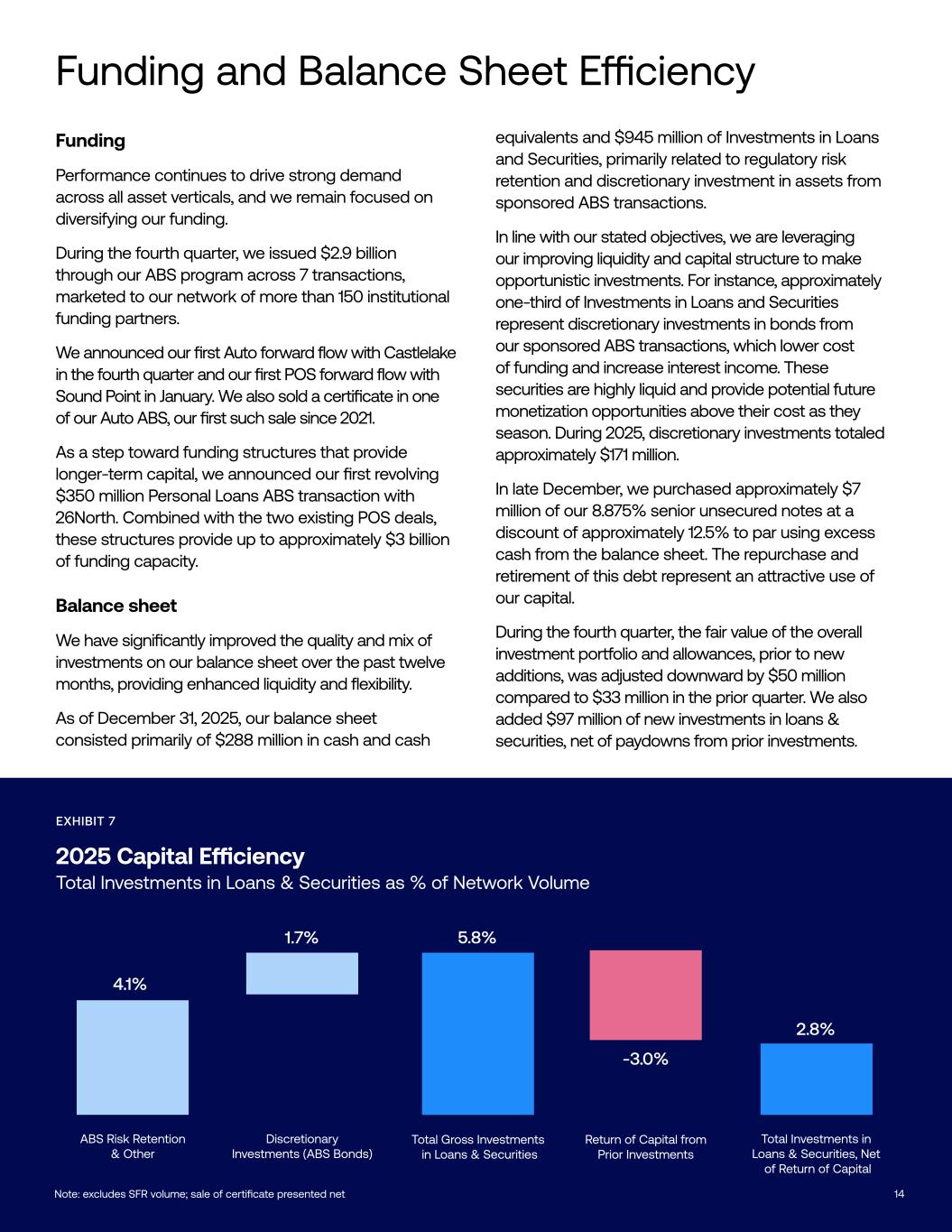 14 Funding and Balance Sheet Efficiency Funding Performance continues to drive strong demand across all asset verticals, and we remain focused on diversifying our funding. During the fourth quarter, we issued $2.9 billion through our ABS program across 7 transactions, marketed to our network of more than 150 institutional funding partners. We announced our first Auto forward flow with Castlelake in the fourth quarter and our first POS forward flow with Sound Point in January. We also sold a certificate in one of our Auto ABS, our first such sale since 2021. As a step toward funding structures that provide longer-term capital, we announced our first revolving $350 million Personal Loans ABS transaction with 26North. Combined with the two existing POS deals, these structures provide up to approximately $3 billion of funding capacity. Balance sheet We have significantly improved the quality and mix of investments on our balance sheet over the past twelve months, providing enhanced liquidity and flexibility. As of December 31, 2025, our balance sheet consisted primarily of $288 million in cash and cash equivalents and $945 million of Investments in Loans and Securities, primarily related to regulatory risk retention and discretionary investment in assets from sponsored ABS transactions. In line with our stated objectives, we are leveraging our improving liquidity and capital structure to make opportunistic investments. For instance, approximately one-third of Investments in Loans and Securities represent discretionary investments in bonds from our sponsored ABS transactions, which lower cost of funding and increase interest income. These securities are highly liquid and provide potential future monetization opportunities above their cost as they season. During 2025, discretionary investments totaled approximately $171 million. In late December, we purchased approximately $7 million of our 8.875% senior unsecured notes at a discount of approximately 12.5% to par using excess cash from the balance sheet. The repurchase and retirement of this debt represent an attractive use of our capital. During the fourth quarter, the fair value of the overall investment portfolio and allowances, prior to new additions, was adjusted downward by $50 million compared to $33 million in the prior quarter. We also added $97 million of new investments in loans & securities, net of paydowns from prior investments. 2025 Capital Efficiency Total Investments in Loans & Securities as % of Network Volume 4.1% 1.7% 5.8% -3.0% 2.8% ABS Risk Retention & Other Discretionary Investments (ABS Bonds) Total Gross Investments in Loans & Securities Return of Capital from Prior Investments Total Investments in Loans & Securities, Net of Return of Capital EXHIBIT 7 Note: excludes SFR volume; sale of certificate presented net
