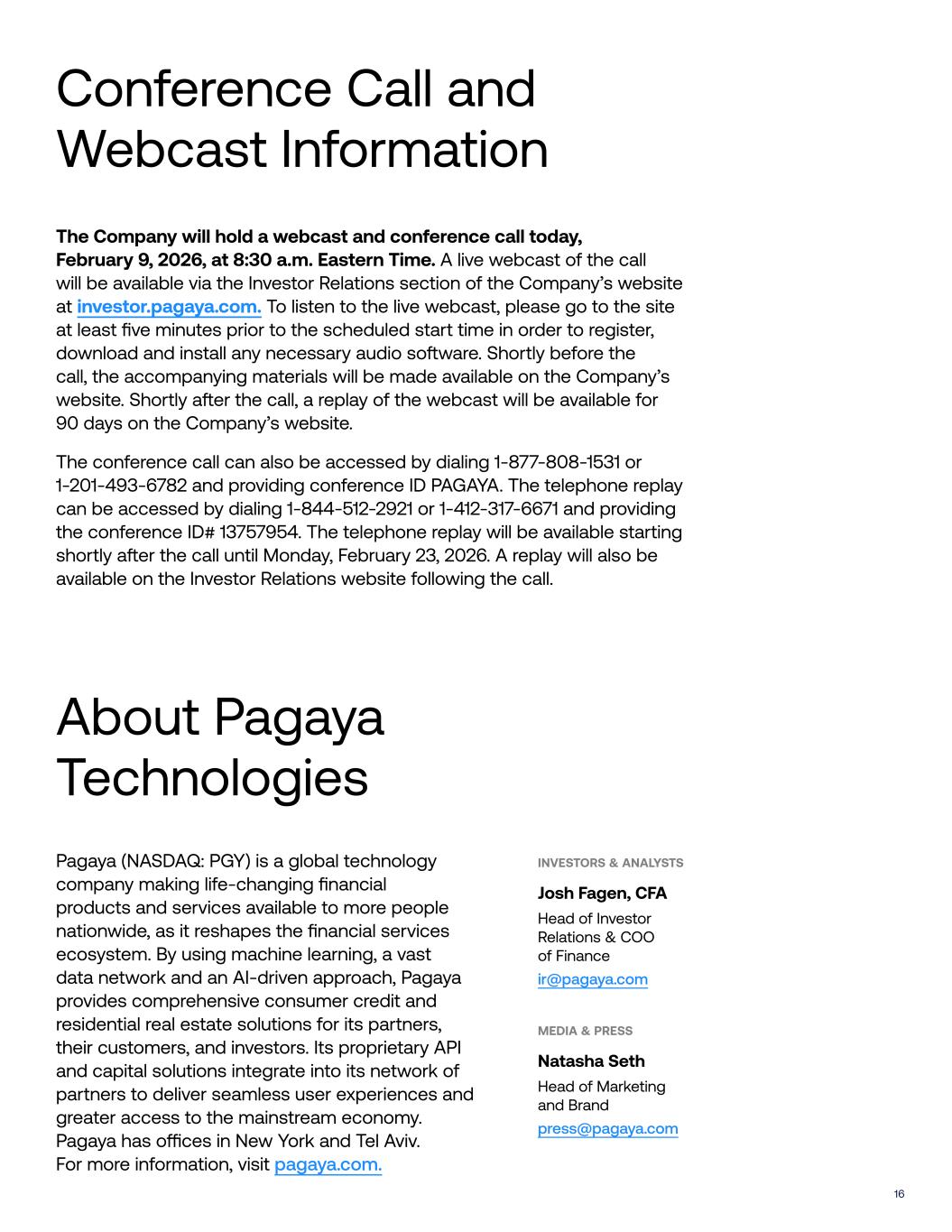 16 Conference Call and Webcast Information The Company will hold a webcast and conference call today, February 9, 2026, at 8:30 a.m. Eastern Time. A live webcast of the call will be available via the Investor Relations section of the Company’s website at investor.pagaya.com. To listen to the live webcast, please go to the site at least five minutes prior to the scheduled start time in order to register, download and install any necessary audio software. Shortly before the call, the accompanying materials will be made available on the Company’s website. Shortly after the call, a replay of the webcast will be available for 90 days on the Company’s website. The conference call can also be accessed by dialing 1-877-808-1531 or 1-201-493-6782 and providing conference ID PAGAYA. The telephone replay can be accessed by dialing 1-844-512-2921 or 1-412-317-6671 and providing the conference ID# 13757954. The telephone replay will be available starting shortly after the call until Monday, February 23, 2026. A replay will also be available on the Investor Relations website following the call. About Pagaya Technologies Pagaya (NASDAQ: PGY) is a global technology company making life-changing financial products and services available to more people nationwide, as it reshapes the financial services ecosystem. By using machine learning, a vast data network and an AI-driven approach, Pagaya provides comprehensive consumer credit and residential real estate solutions for its partners, their customers, and investors. Its proprietary API and capital solutions integrate into its network of partners to deliver seamless user experiences and greater access to the mainstream economy. Pagaya has offices in New York and Tel Aviv. For more information, visit pagaya.com. INVESTORS & ANALYSTS Josh Fagen, CFA Head of Investor Relations & COO of Finance ir@pagaya.com MEDIA & PRESS Natasha Seth Head of Marketing and Brand press@pagaya.com