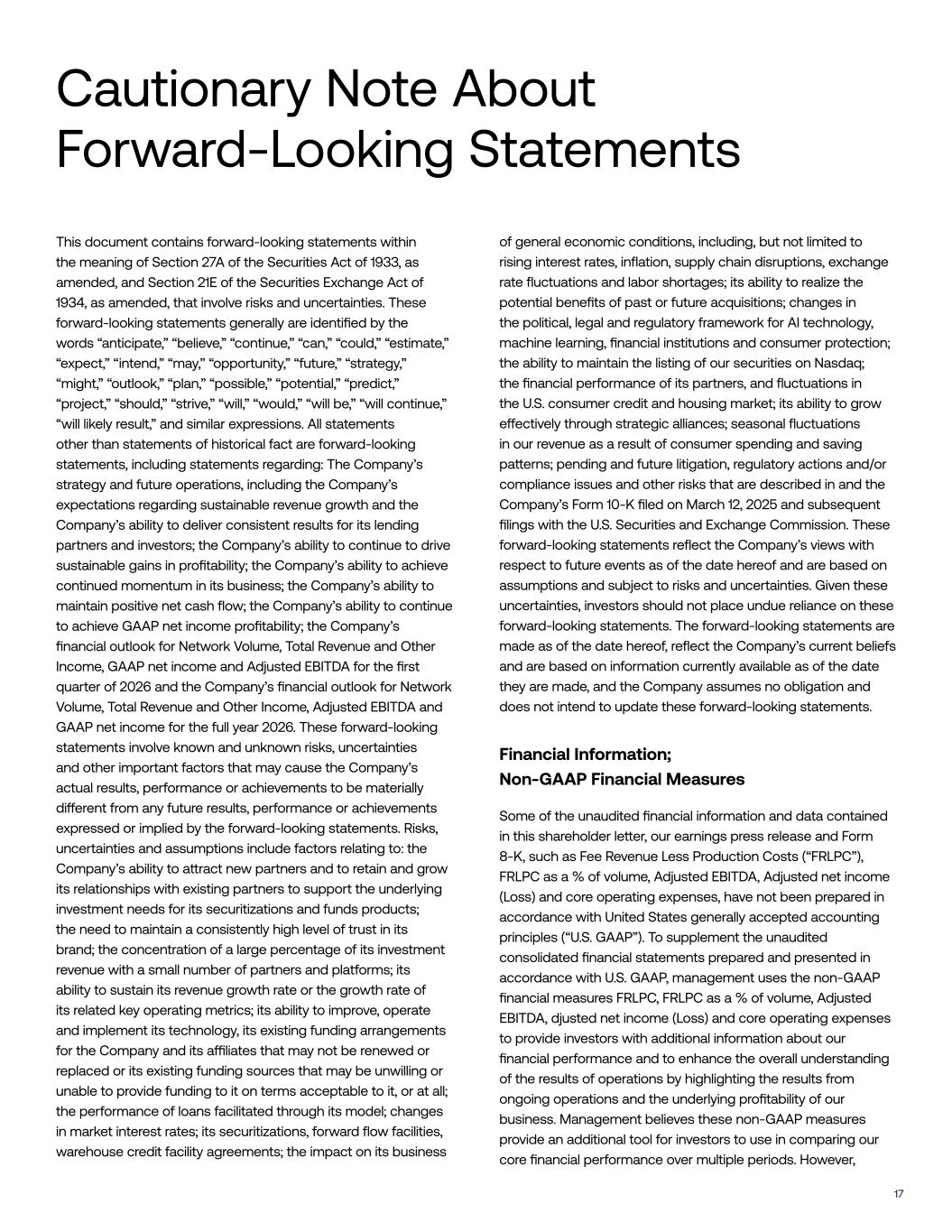 17 This document contains forward-looking statements within the meaning of Section 27A of the Securities Act of 1933, as amended, and Section 21E of the Securities Exchange Act of 1934, as amended, that involve risks and uncertainties. These forward-looking statements generally are identified by the words “anticipate,” “believe,” “continue,” “can,” “could,” “estimate,” “expect,” “intend,” “may,” “opportunity,” “future,” “strategy,” “might,” “outlook,” “plan,” “possible,” “potential,” “predict,” “project,” “should,” “strive,” “will,” “would,” “will be,” “will continue,” “will likely result,” and similar expressions. All statements other than statements of historical fact are forward-looking statements, including statements regarding: The Company’s strategy and future operations, including the Company’s expectations regarding sustainable revenue growth and the Company’s ability to deliver consistent results for its lending partners and investors; the Company’s ability to continue to drive sustainable gains in profitability; the Company’s ability to achieve continued momentum in its business; the Company’s ability to maintain positive net cash flow; the Company’s ability to continue to achieve GAAP net income profitability; the Company’s financial outlook for Network Volume, Total Revenue and Other Income, GAAP net income and Adjusted EBITDA for the first quarter of 2026 and the Company’s financial outlook for Network Volume, Total Revenue and Other Income, Adjusted EBITDA and GAAP net income for the full year 2026. These forward-looking statements involve known and unknown risks, uncertainties and other important factors that may cause the Company’s actual results, performance or achievements to be materially different from any future results, performance or achievements expressed or implied by the forward-looking statements. Risks, uncertainties and assumptions include factors relating to: the Company’s ability to attract new partners and to retain and grow its relationships with existing partners to support the underlying investment needs for its securitizations and funds products; the need to maintain a consistently high level of trust in its brand; the concentration of a large percentage of its investment revenue with a small number of partners and platforms; its ability to sustain its revenue growth rate or the growth rate of its related key operating metrics; its ability to improve, operate and implement its technology, its existing funding arrangements for the Company and its affiliates that may not be renewed or replaced or its existing funding sources that may be unwilling or unable to provide funding to it on terms acceptable to it, or at all; the performance of loans facilitated through its model; changes in market interest rates; its securitizations, forward flow facilities, warehouse credit facility agreements; the impact on its business of general economic conditions, including, but not limited to rising interest rates, inflation, supply chain disruptions, exchange rate fluctuations and labor shortages; its ability to realize the potential benefits of past or future acquisitions; changes in the political, legal and regulatory framework for AI technology, machine learning, financial institutions and consumer protection; the ability to maintain the listing of our securities on Nasdaq; the financial performance of its partners, and fluctuations in the U.S. consumer credit and housing market; its ability to grow effectively through strategic alliances; seasonal fluctuations in our revenue as a result of consumer spending and saving patterns; pending and future litigation, regulatory actions and/or compliance issues and other risks that are described in and the Company’s Form 10-K filed on March 12, 2025 and subsequent filings with the U.S. Securities and Exchange Commission. These forward-looking statements reflect the Company’s views with respect to future events as of the date hereof and are based on assumptions and subject to risks and uncertainties. Given these uncertainties, investors should not place undue reliance on these forward-looking statements. The forward-looking statements are made as of the date hereof, reflect the Company’s current beliefs and are based on information currently available as of the date they are made, and the Company assumes no obligation and does not intend to update these forward-looking statements. Financial Information; Non-GAAP Financial Measures Some of the unaudited financial information and data contained in this shareholder letter, our earnings press release and Form 8-K, such as Fee Revenue Less Production Costs (“FRLPC”), FRLPC as a % of volume, Adjusted EBITDA, Adjusted net income (Loss) and core operating expenses, have not been prepared in accordance with United States generally accepted accounting principles (“U.S. GAAP”). To supplement the unaudited consolidated financial statements prepared and presented in accordance with U.S. GAAP, management uses the non-GAAP financial measures FRLPC, FRLPC as a % of volume, Adjusted EBITDA, djusted net income (Loss) and core operating expenses to provide investors with additional information about our financial performance and to enhance the overall understanding of the results of operations by highlighting the results from ongoing operations and the underlying profitability of our business. Management believes these non-GAAP measures provide an additional tool for investors to use in comparing our core financial performance over multiple periods. However, Cautionary Note About Forward-Looking Statements